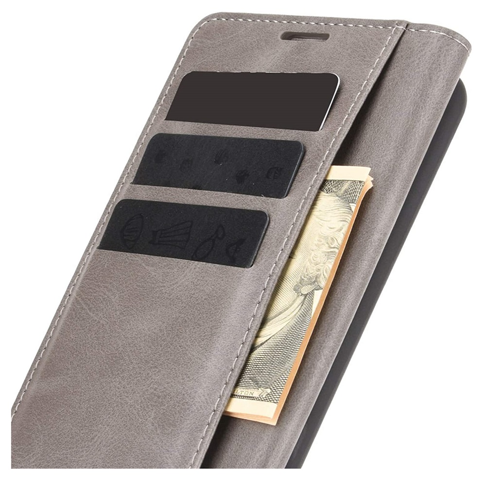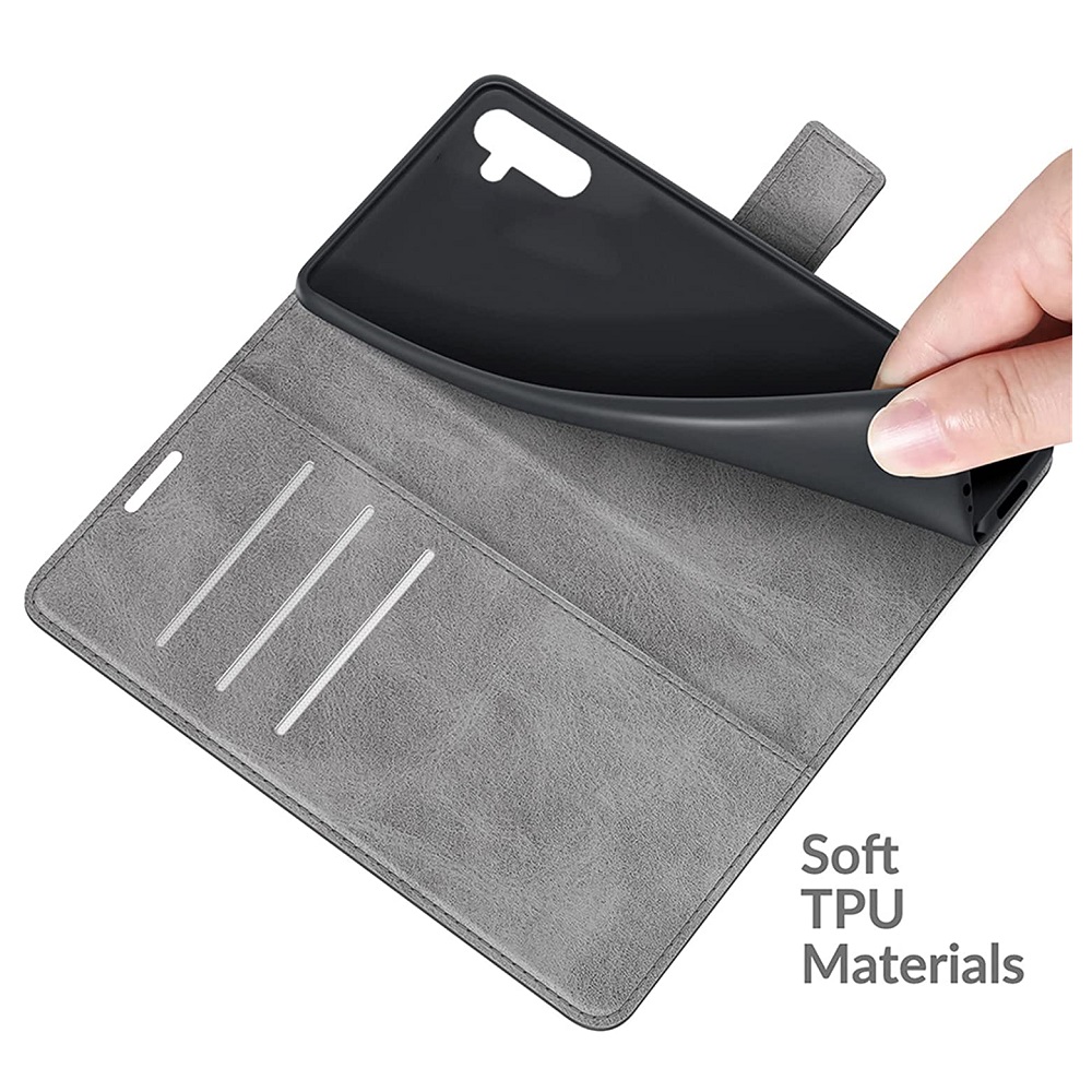 [ Portemonnee-ontwerp ] De Grijs gekleurde bookcase beschikt ook over kaartvakken, waarbij u uw belangrijke kaarten in kunt plaatsen. Portemonnee en telefoonhoesje in 1.