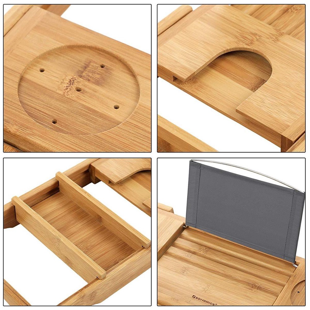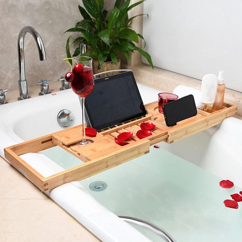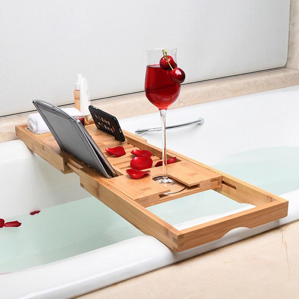 Het in bad ontspannen wordt nog lekkerder met dit mooie verstelbare bamboe badrekje. Even en film of aflevering kijken, of rustig (romantisch) genieten met geurkaarsen om je heen. Met deze bamboe hout badplank is dat voortaan mogelijk.