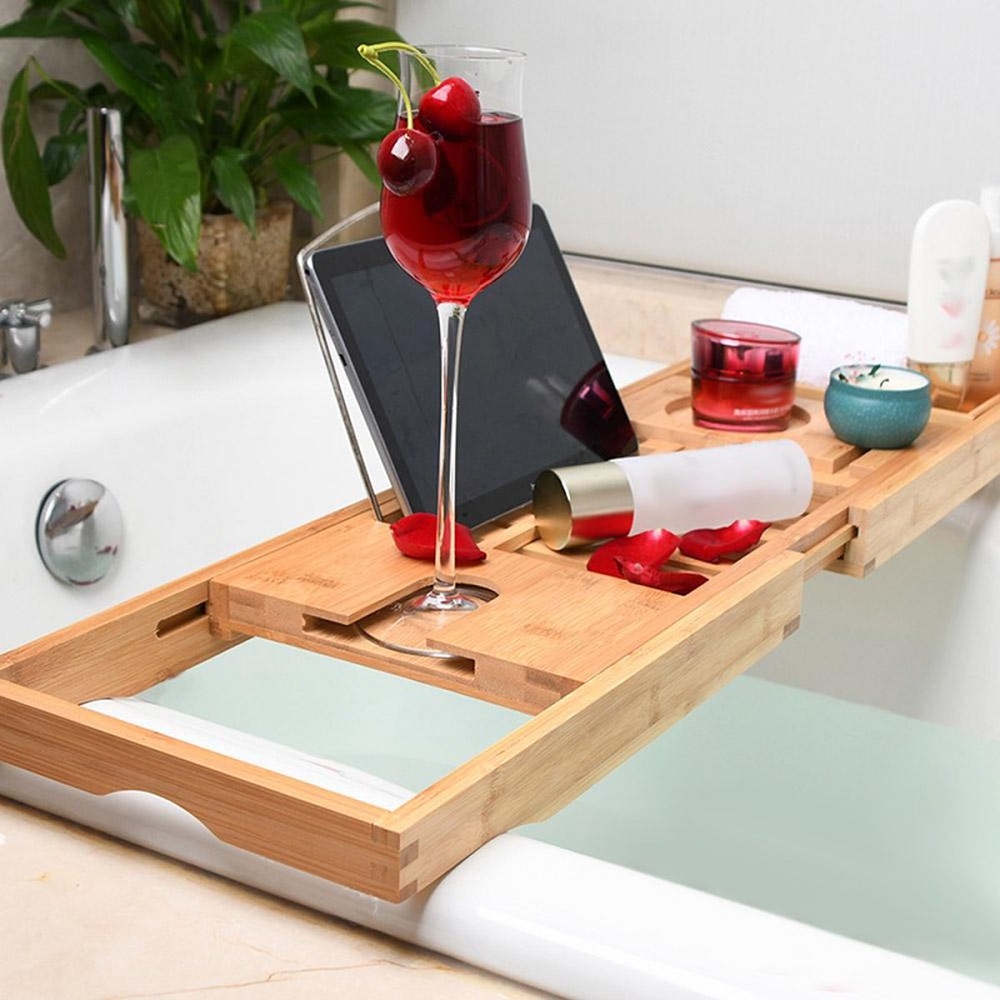 [Multifunctioneel] De badplank heeft meerdere plaatsingsmogelijkheden. O.a. voor (wijn)glazen, tablets, telefoons, doekjes, kaarsen, et cetera