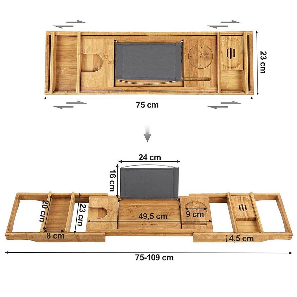 [Universeel] Met deze 75 cm brede bamboe hout badplank heb je de mogelijkheid om de badplank uit te schuiven t/m 109 cm waardoor het geschikt is voor vrijwel elke badkuip.