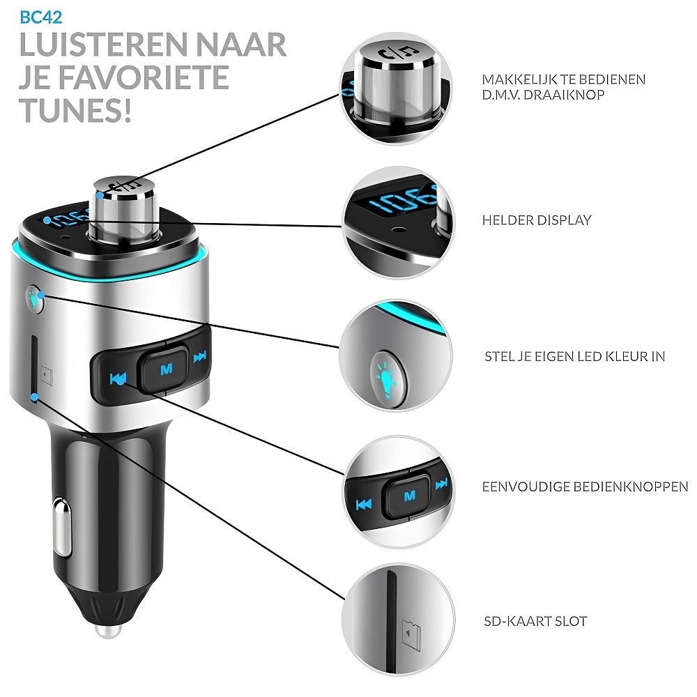 Er rijden miljoenen auto’s in Nederland die niet voorzien zijn van Bluetooth. Vele auto’s hebben zelfs bluetooth maar die zijn dan weer alleen bedoeld voor telefoonoproepen en niet geschikt om muziek te stream. Een duur alternatief is meestal om je hele multimediasysteem tevervangen met een moderne multimediasysteem die is voorzien nieuwere functies. Echter hebben we het hier dan over bedragen van minimaal 200 euro. Een goedkoop alternatief met de beste prijs/kwaliteitverhouding is daarom een FM-Transmitter. De Luxebass BC42 Bluetooth Transmitter Auto met USB en SD-kaart aansluiting is een perfecte alternatief.