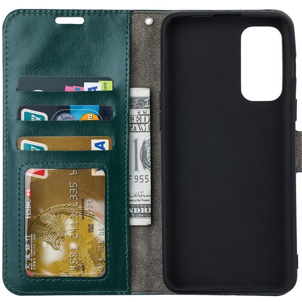 [Portemonnee-ontwerp] De Groen gekleurde bookcase beschikt ook over kaartvakken, waarbij u uw belangrijke kaarten in kunt plaatsen. Portemonnee en telefoonhoesje in 1.