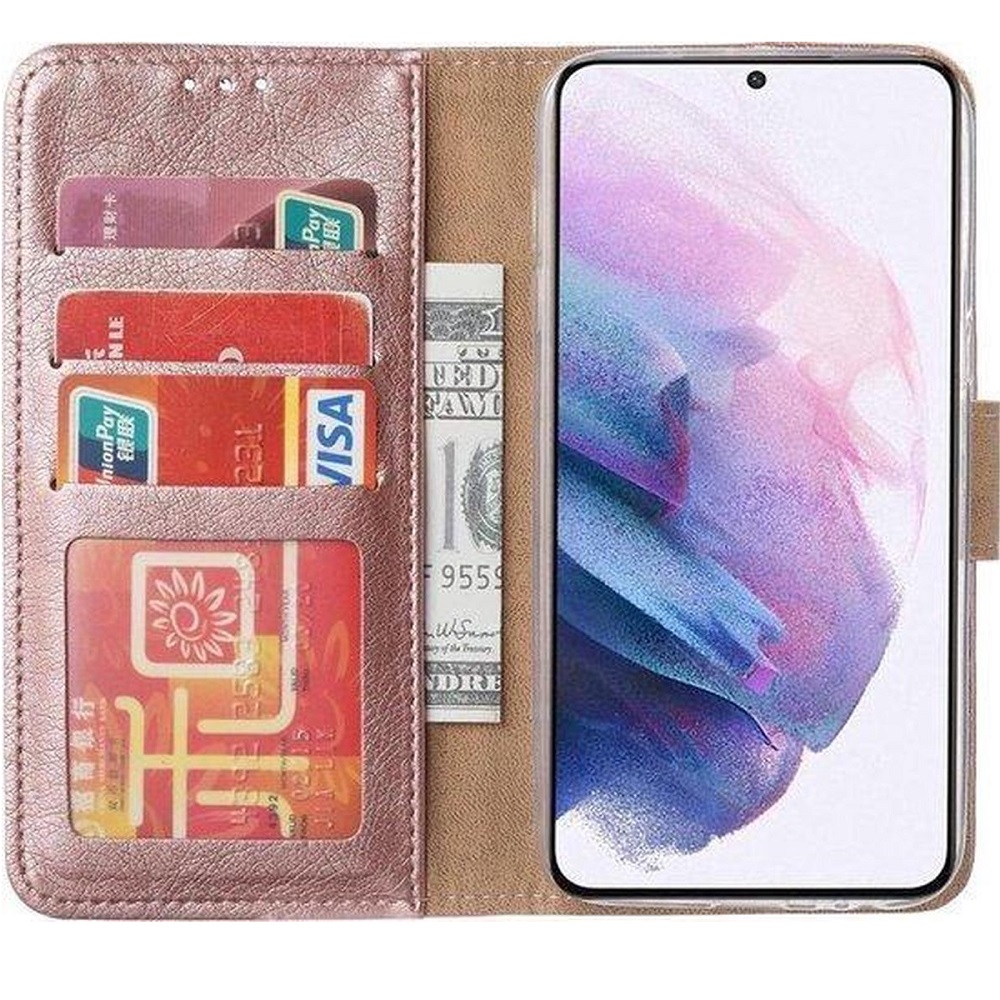 [Portemonnee-ontwerp] De rose goud gekleurde bookcase beschikt ook over kaartvakken, waarbij u uw belangrijke kaarten in kunt plaatsen. Portemonnee en telefoonhoesje in 1.