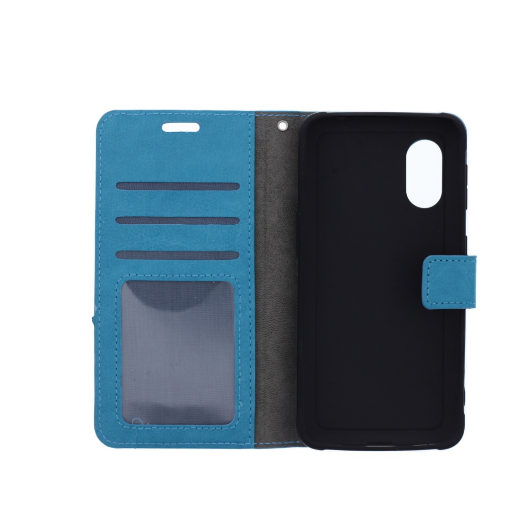 [Portemonnee-ontwerp] De turquoise gekleurde bookcase beschikt ook over kaartvakken, waarbij u uw belangrijke kaarten in kunt plaatsen. Portemonnee en telefoonhoesje in 1.