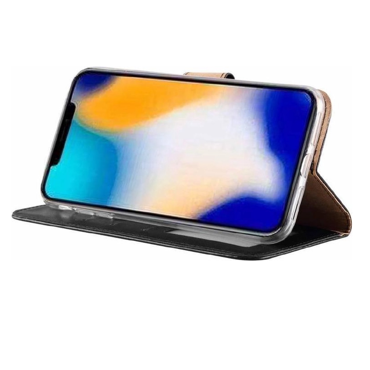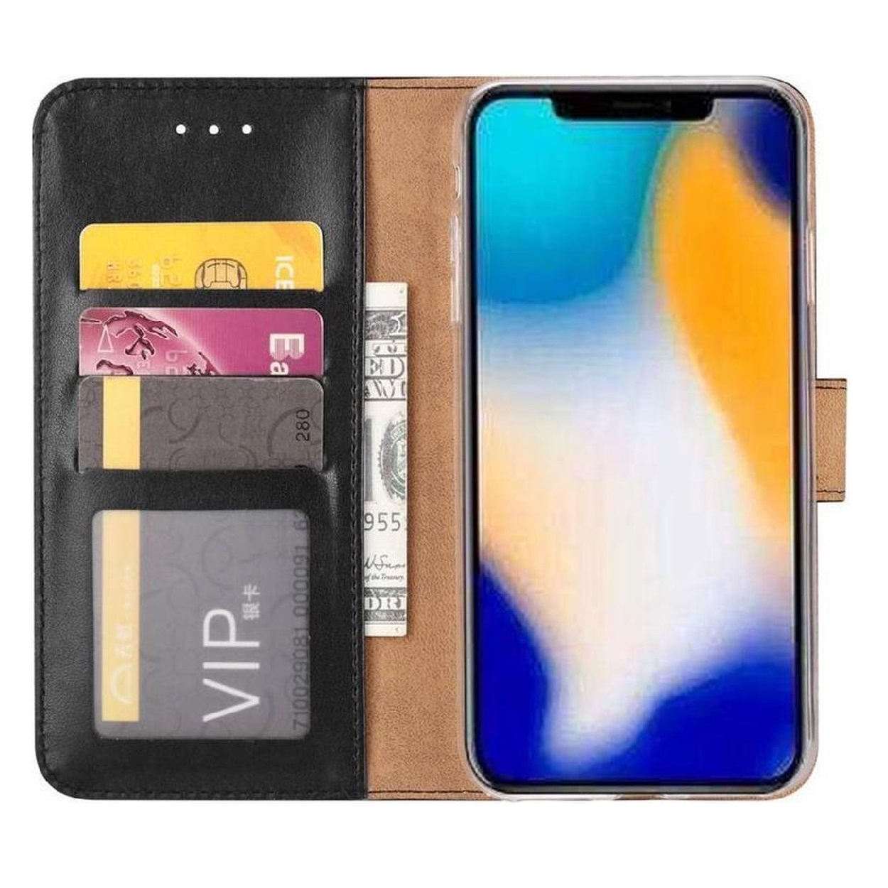 [Portemonnee-ontwerp] De zwart gekleurde bookcase beschikt ook over kaartvakken, waarbij u uw belangrijke kaarten in kunt plaatsen. Portemonnee en telefoonhoesje in 1.