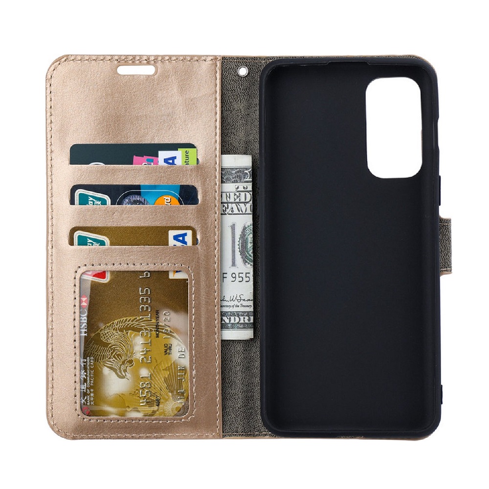 [Portemonnee-ontwerp] De Goud gekleurde bookcase beschikt ook over kaartvakken, waarbij u uw belangrijke kaarten in kunt plaatsen. Portemonnee en telefoonhoesje in 1.