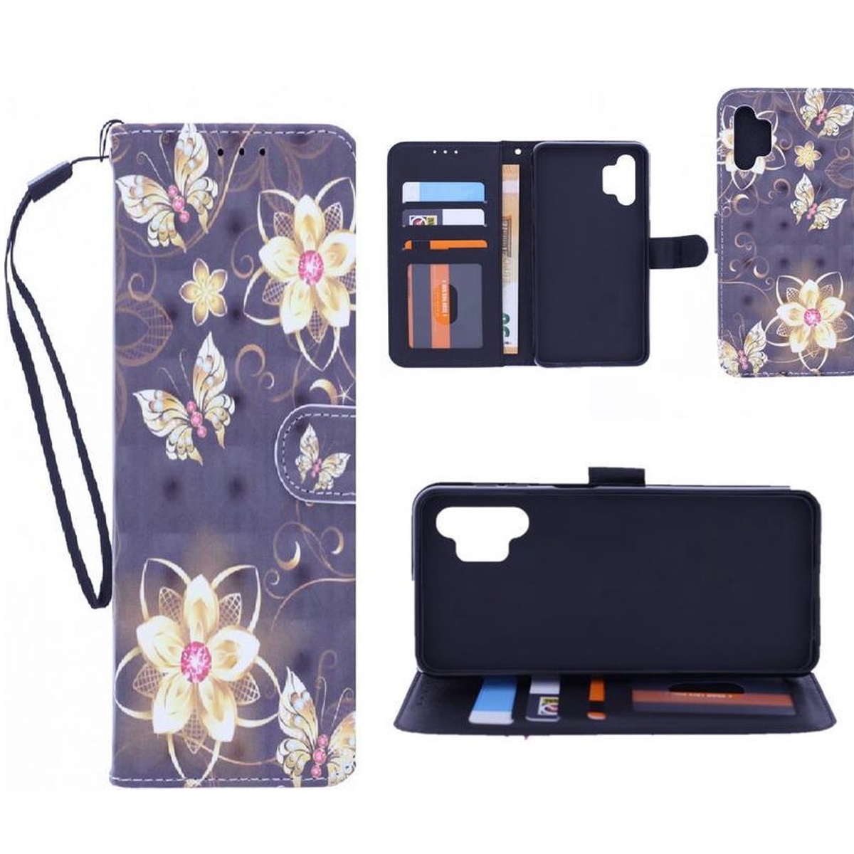 [Portemonnee-ontwerp] De Butterflies And Flowers 3D bookcase beschikt ook over kaartvakken, waarbij u uw belangrijke kaarten in kunt plaatsen. Portemonnee en telefoonhoesje in 1.