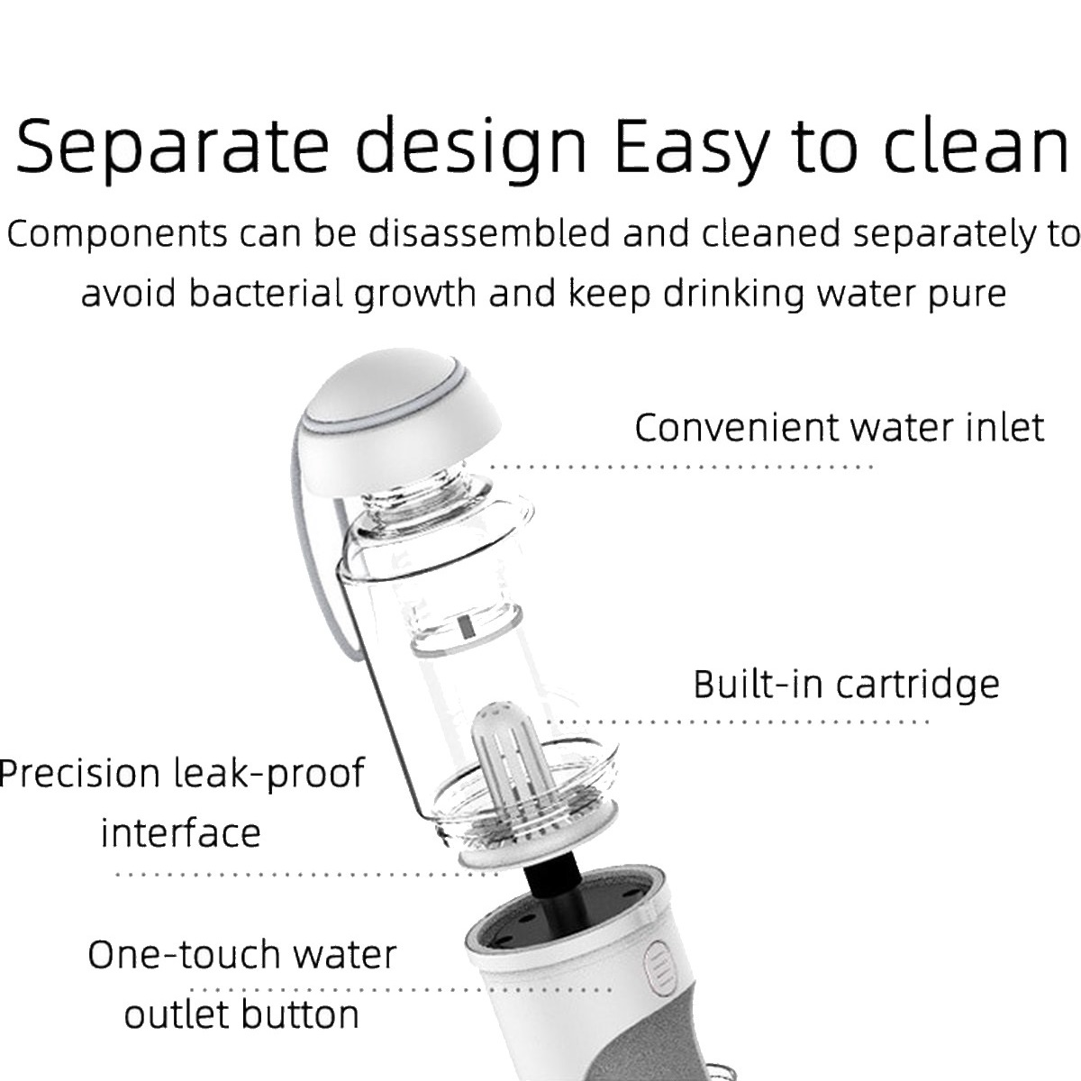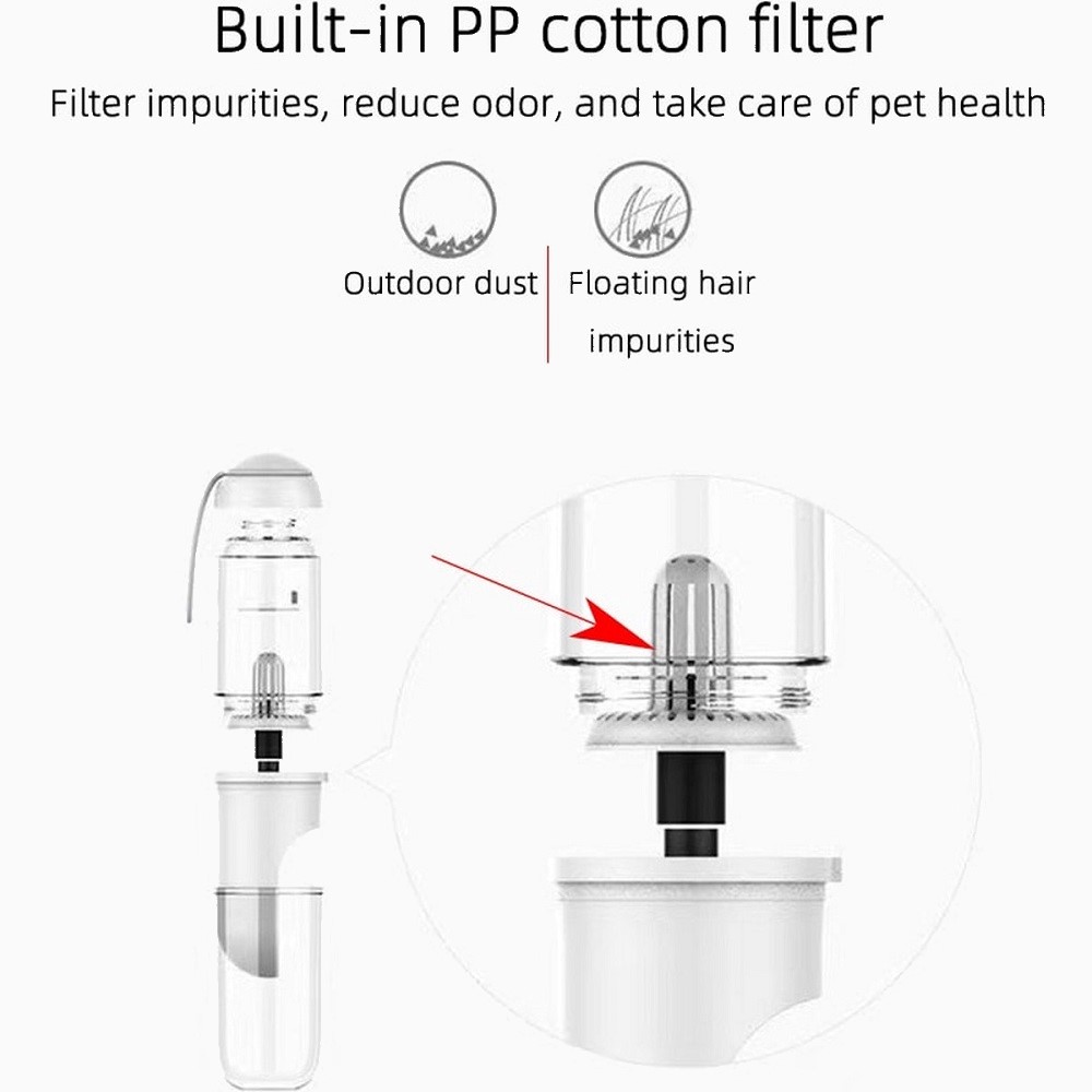 De honden drinkfles is voorzien van een wateruitlaatknop die je kan gebruiken om het water vrij te laten naar het kommetje. De honden drinkfles is voorzien van een filter element wat effectief onzuiverheden uit het water filtert.