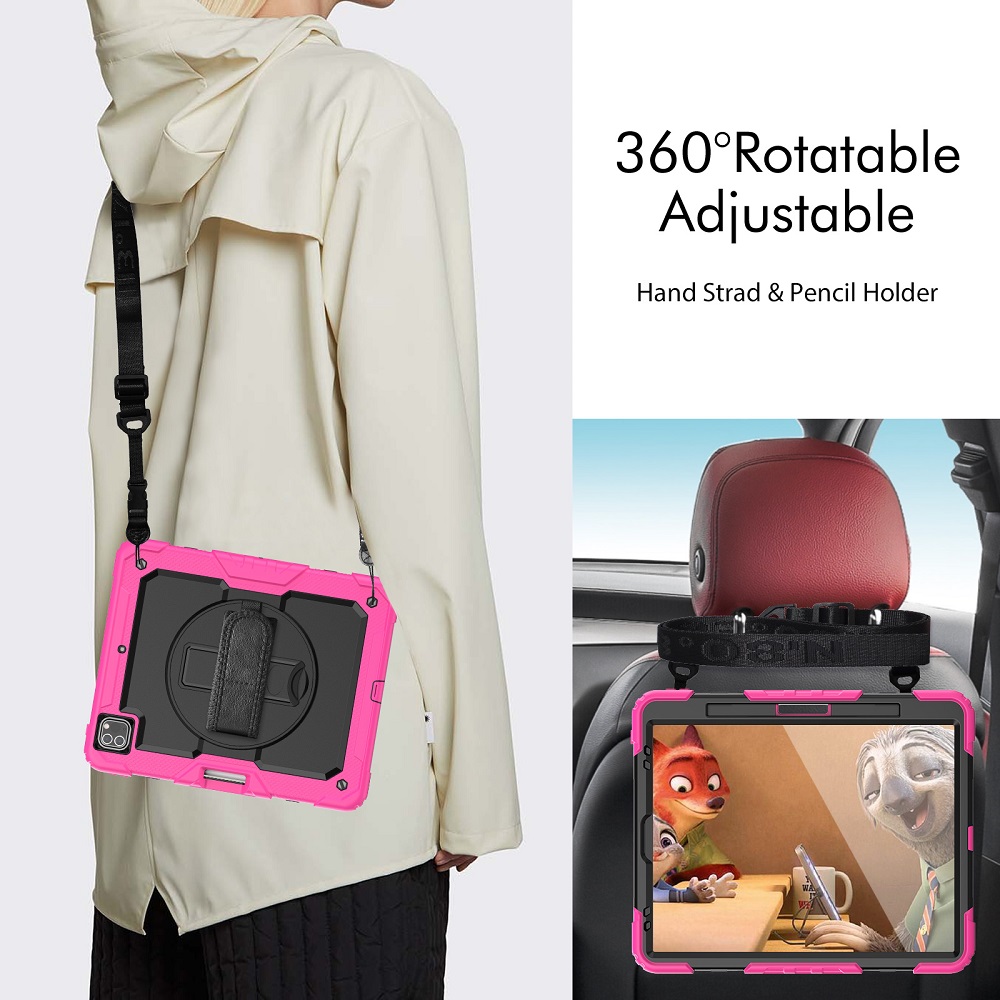 De beschermhoes zorgt voor een volledige bescherming en heeft een strap die je kan gebruiken om je handen erin te doen of eventueel vast te maken aan een object. Ook is het voorzien van een riem die je kan gebruiken om de tablet te dragen of vast te maken aan een object. Daarnaast is het voorzien van een roteerbaar standaard waarmee je de tablet zowel verticaal of horizontaal ergens te plaatsen.