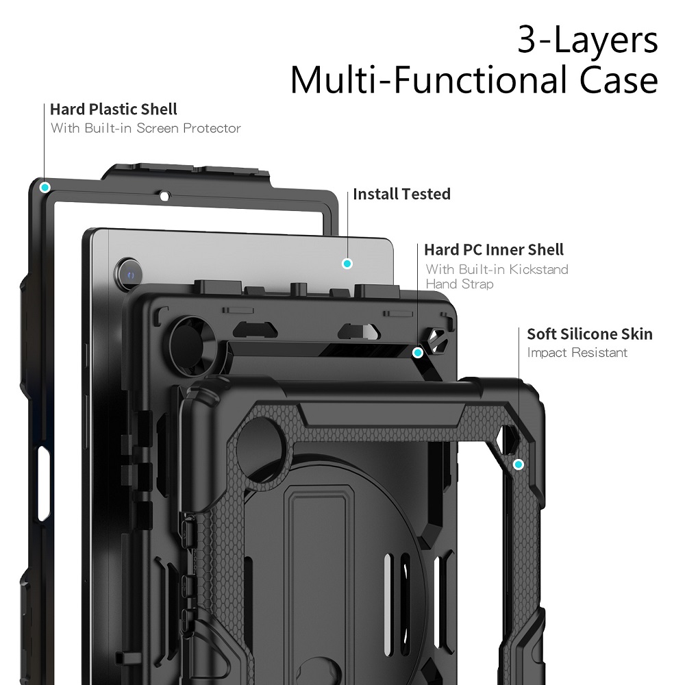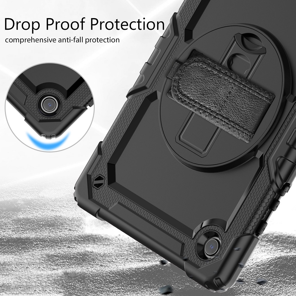 De beschermhoes zorgt voor een volledige bescherming en heeft een strap die je kan gebruiken om je handen erin te doen of eventueel vast te maken aan een object. Ook is het voorzien van een riem die je kan gebruiken om de tablet te dragen of vast te maken aan een object. Daarnaast is het voorzien van een roteerbaar standaard waarmee je de tablet zowel verticaal of horizontaal ergens te plaatsen.