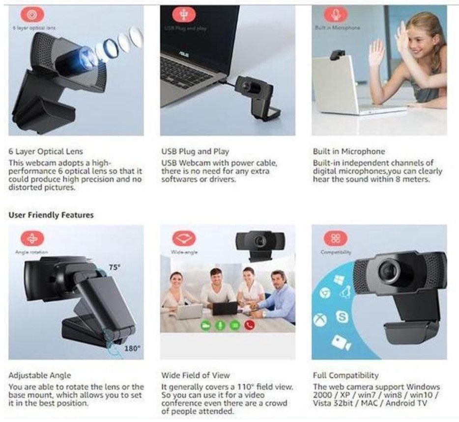 Beschrijving: [720PHD High Quality] De webcam produceert Full HD-transmissie in 720P bij 30fps. Uitgerust met witbalanslichttechnologie, past de webcamera automatisch de belichting aan om de beste scène vast te leggen. [Ingebouwde microfoon] De webcamera is voorzien van USB 2.0 plug and play. Het brengt ruisvrije audio over en geluid binnen 8 meter is duidelijk hoorbaar. [Ontworpen voor laptops en desktops] Dankzij de flexibele standaardbevestiging is de webcam geschikt voor alle soorten laptops, desktops, lcd’s en andere beeldschermen. Het ondersteunt 180 ° op- en neerwaartse rotatie. [Volledige compatibiliteit] Windows 7, Windows 8 of Windows 10, macOS X 10.7 of hoger, Chrome OS-versie 29.0.1547.70 en hoger. [Mutiple Application] We ontwerpen deze webcam voor uw leven thuis. Online onderwijs, videovergadering thuis, videogesprek, live,