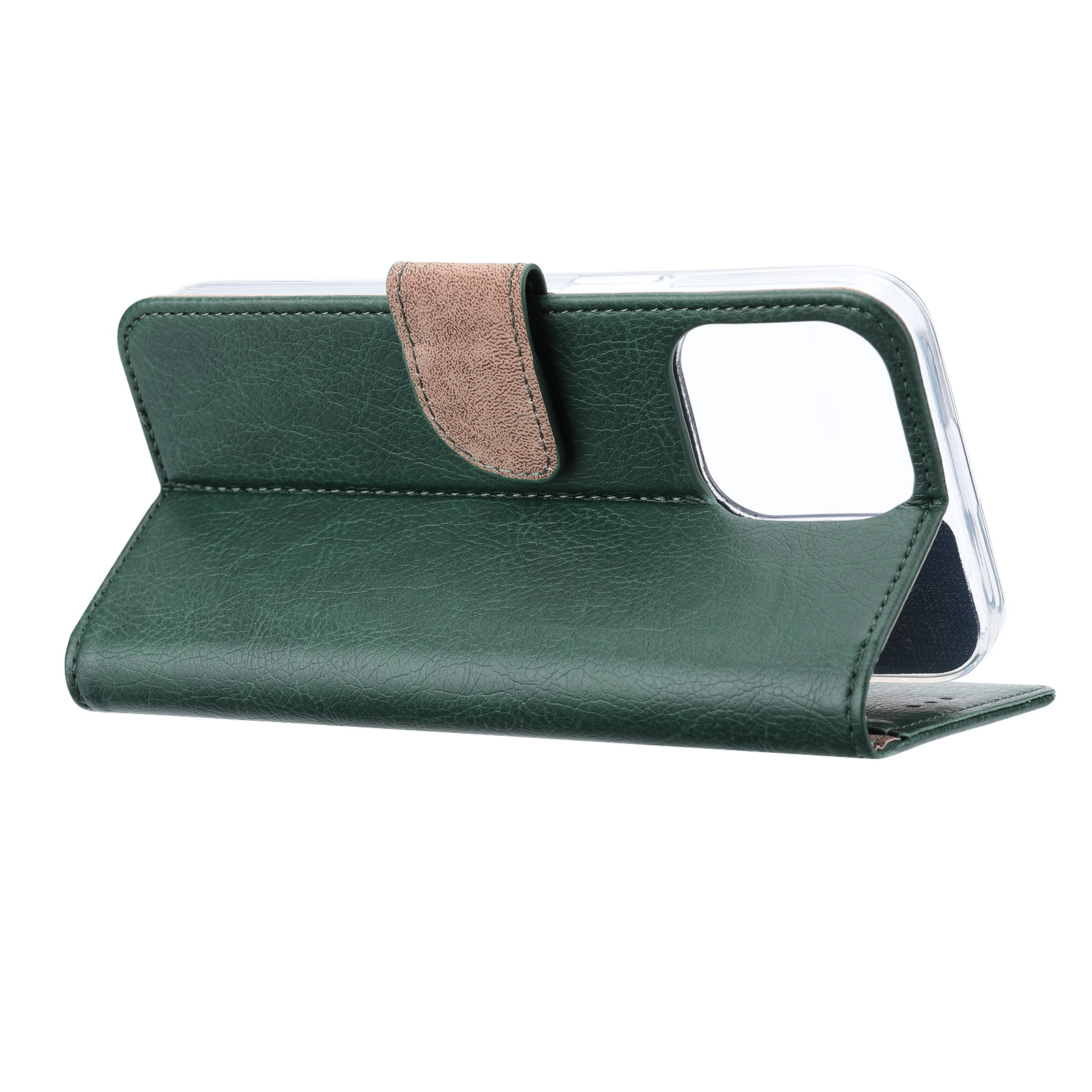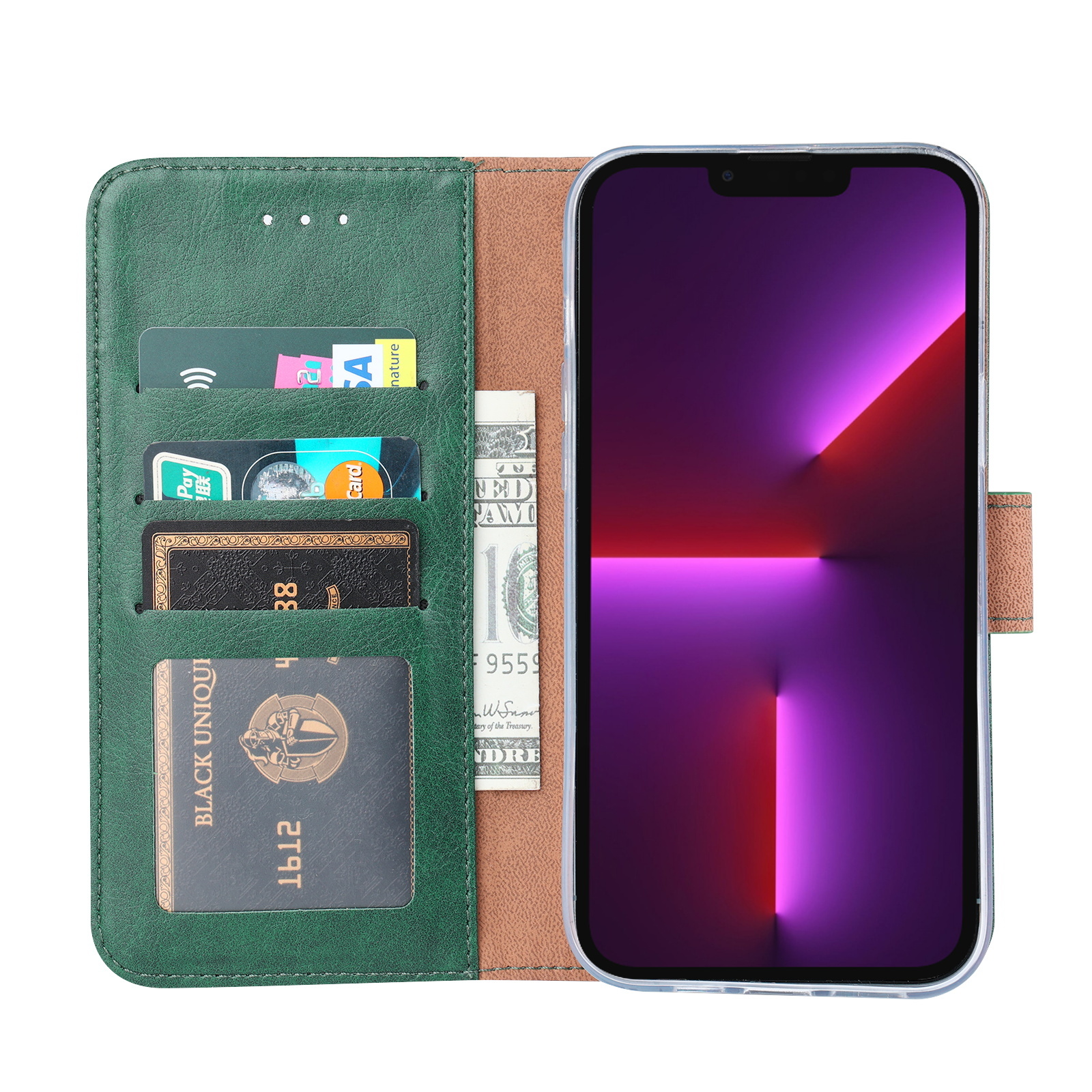 [ Portemonnee-ontwerp ] De Groen gekleurde bookcase beschikt ook over kaartvakken, waarbij u uw belangrijke kaarten in kunt plaatsen. Portemonnee en telefoonhoesje in 1.