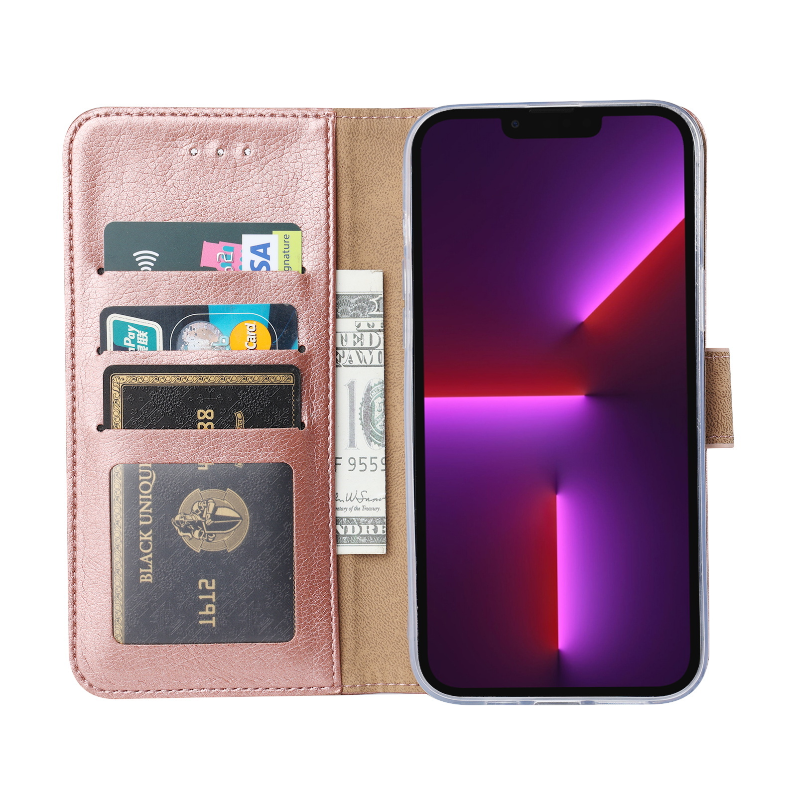 [ Portemonnee-ontwerp ] De RoseGoud gekleurde bookcase beschikt ook over kaartvakken, waarbij u uw belangrijke kaarten in kunt plaatsen. Portemonnee en telefoonhoesje in 1.