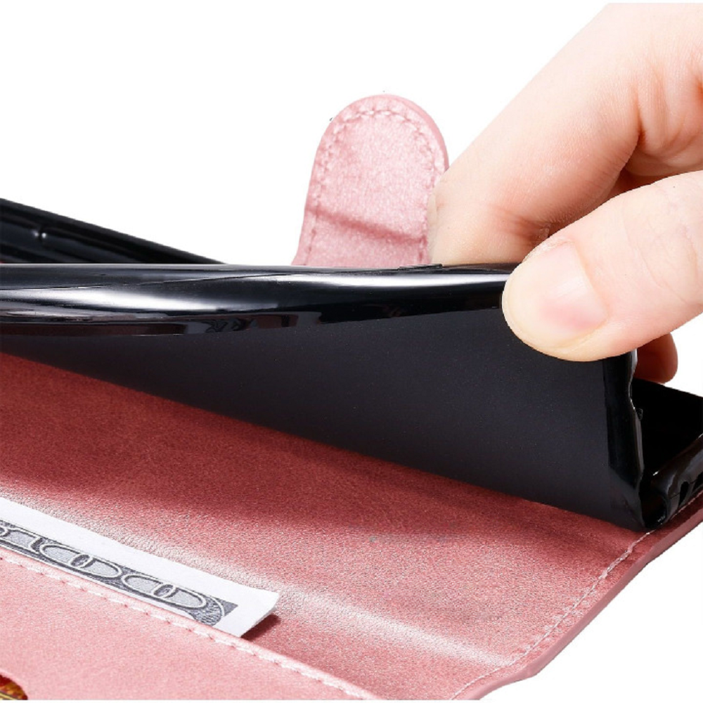 [ Portemonnee-ontwerp ] De Rosegoud gekleurde bookcase beschikt ook over kaartvakken, waarbij u uw belangrijke kaarten in kunt plaatsen. Portemonnee en telefoonhoesje in 1.