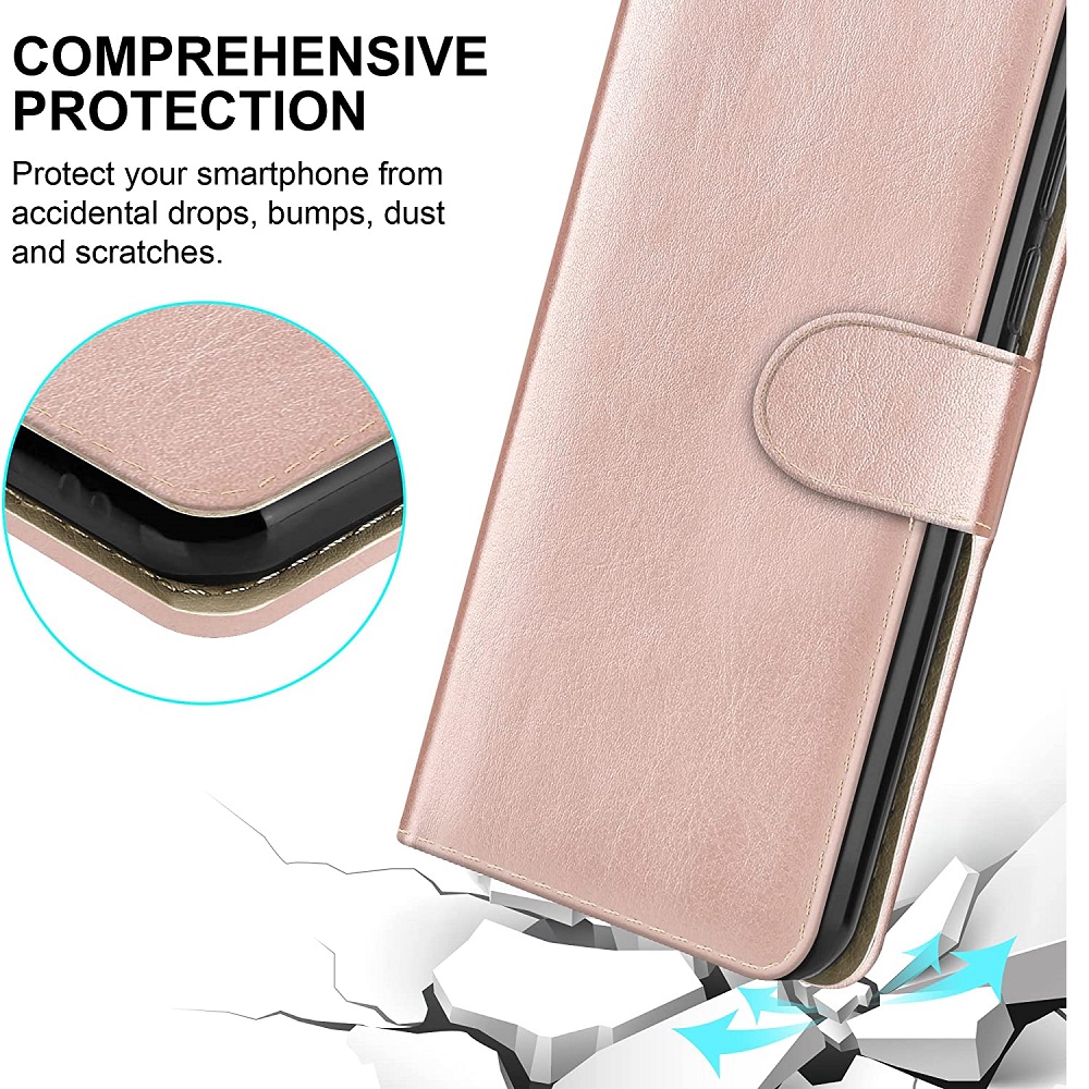 [ Portemonnee-ontwerp ] De RoseGoud gekleurde bookcase beschikt ook over kaartvakken, waarbij u uw belangrijke kaarten in kunt plaatsen. Portemonnee en telefoonhoesje in 1.