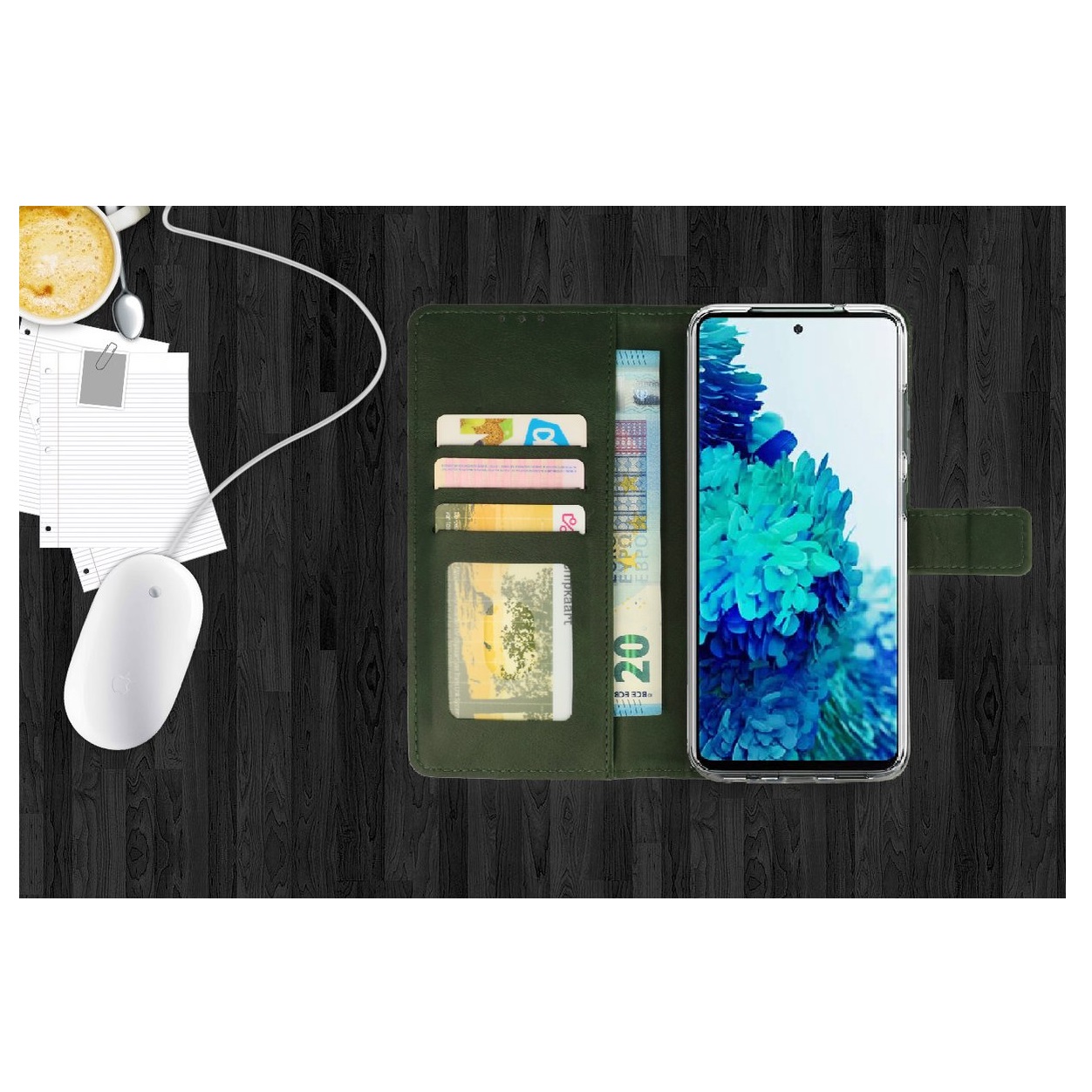 [ Portemonnee-ontwerp ] De Groen gekleurde bookcase beschikt ook over kaartvakken, waarbij u uw belangrijke kaarten in kunt plaatsen. Portemonnee en telefoonhoesje in 1.