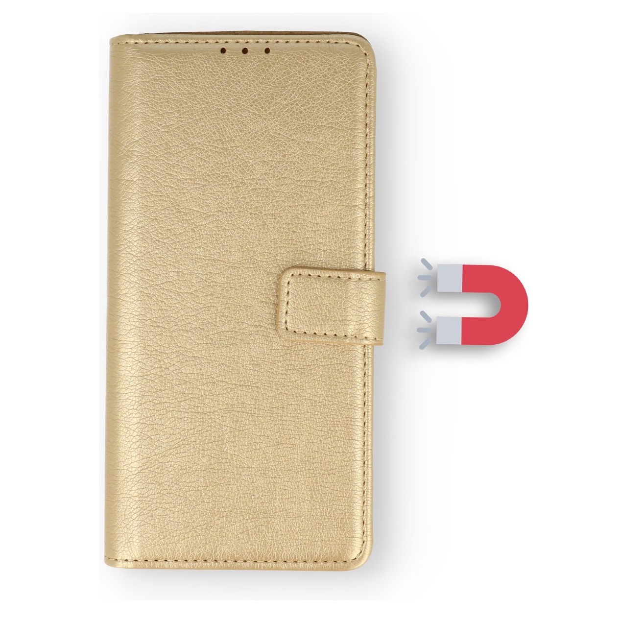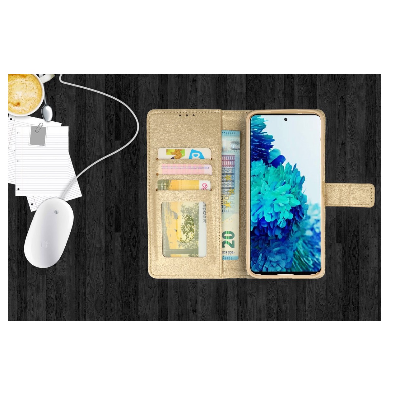 [ Portemonnee-ontwerp ] De Goud gekleurde bookcase beschikt ook over kaartvakken, waarbij u uw belangrijke kaarten in kunt plaatsen. Portemonnee en telefoonhoesje in 1.