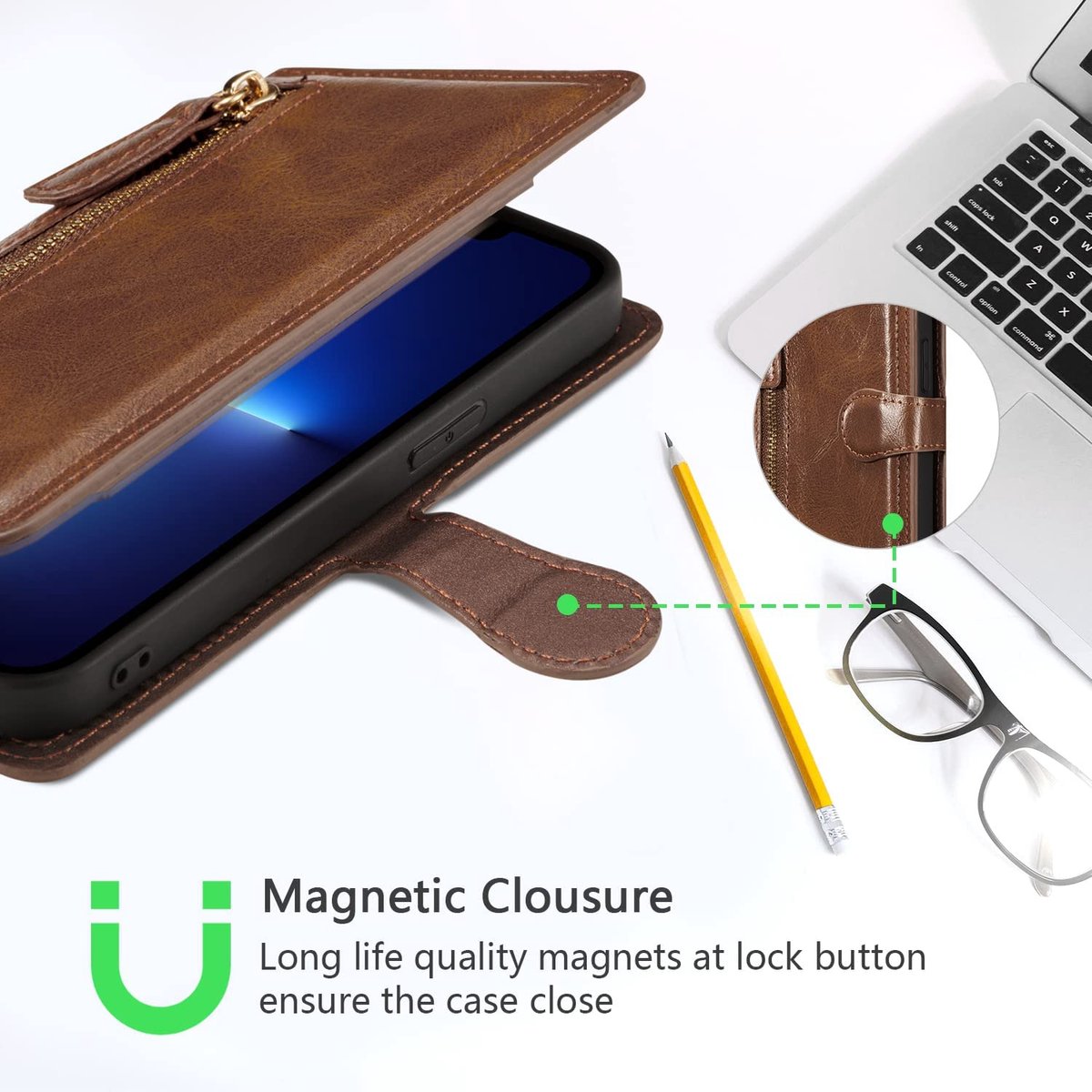 [ Magnetische systeem ] De magnetische sluiting houdt uw telefoon en uw kaarten veilig en zorgt ervoor dat de bookcase zich automatisch sluit na gebruik.