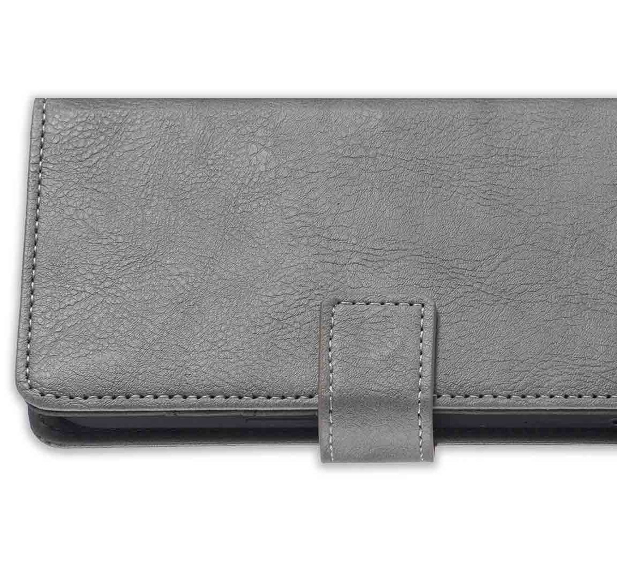 [ Portemonnee-ontwerp ] De Grijs gekleurde bookcase beschikt ook over kaartvakken, waarbij u uw belangrijke kaarten in kunt plaatsen. Portemonnee en telefoonhoesje in 1.