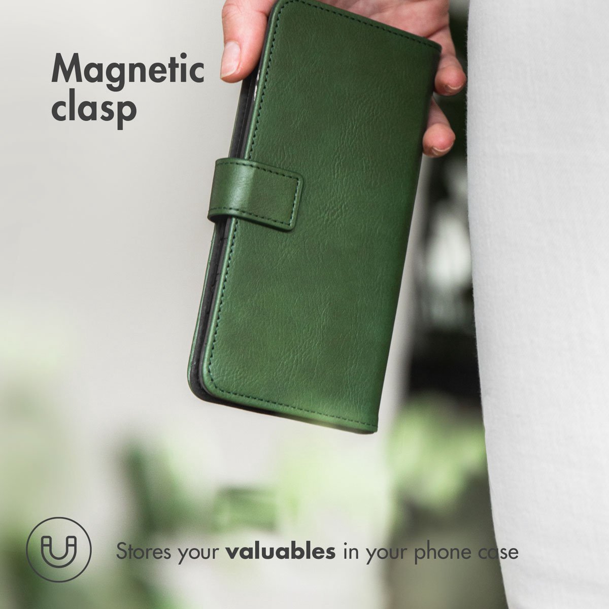 [ Magnetische systeem ] De magnetische sluiting houdt uw telefoon en uw kaarten veilig en zorgt ervoor dat de bookcase zich automatisch sluit na gebruik.