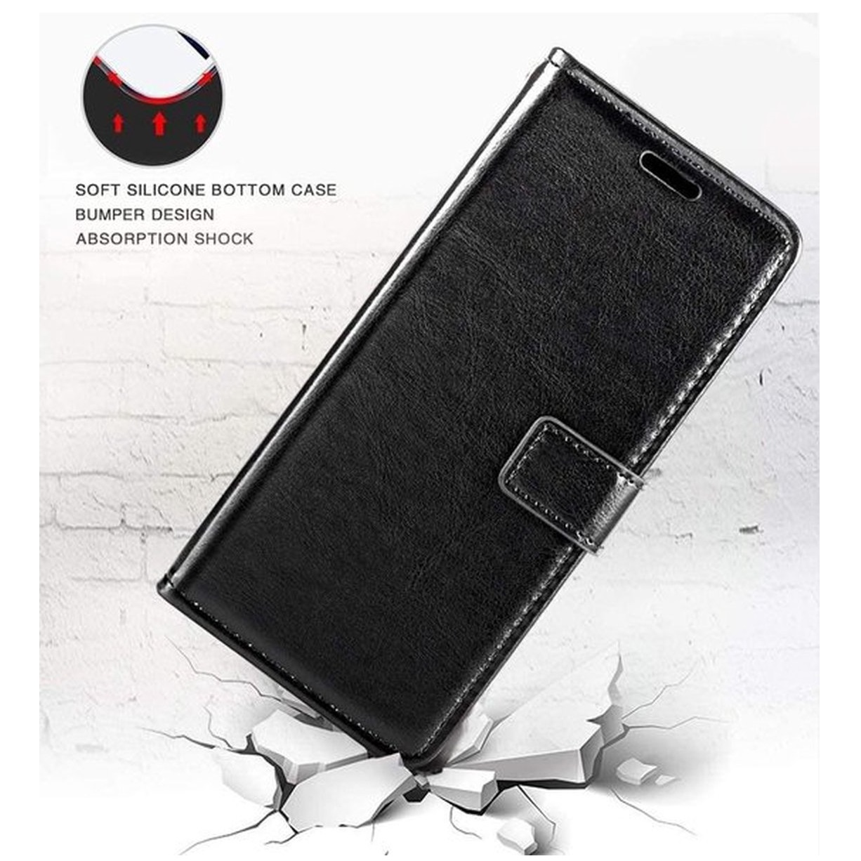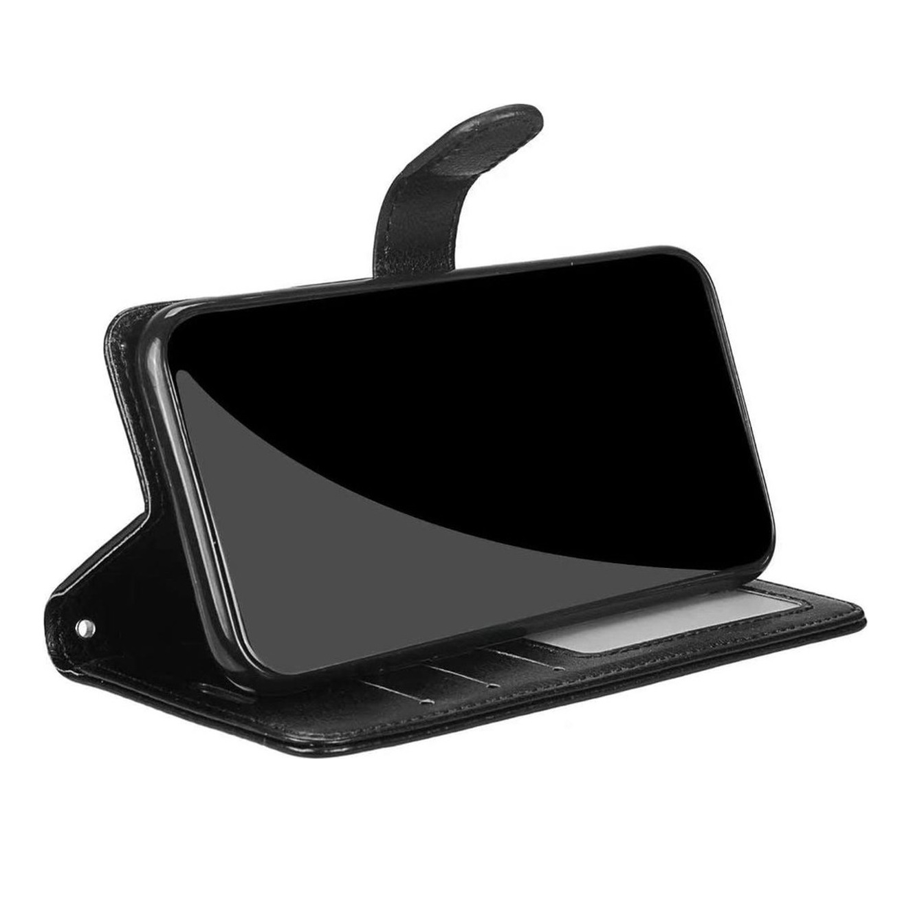 [ Portemonnee-ontwerp ] De Zwart gekleurde bookcase beschikt ook over kaartvakken, waarbij u uw belangrijke kaarten in kunt plaatsen. Portemonnee en telefoonhoesje in 1.