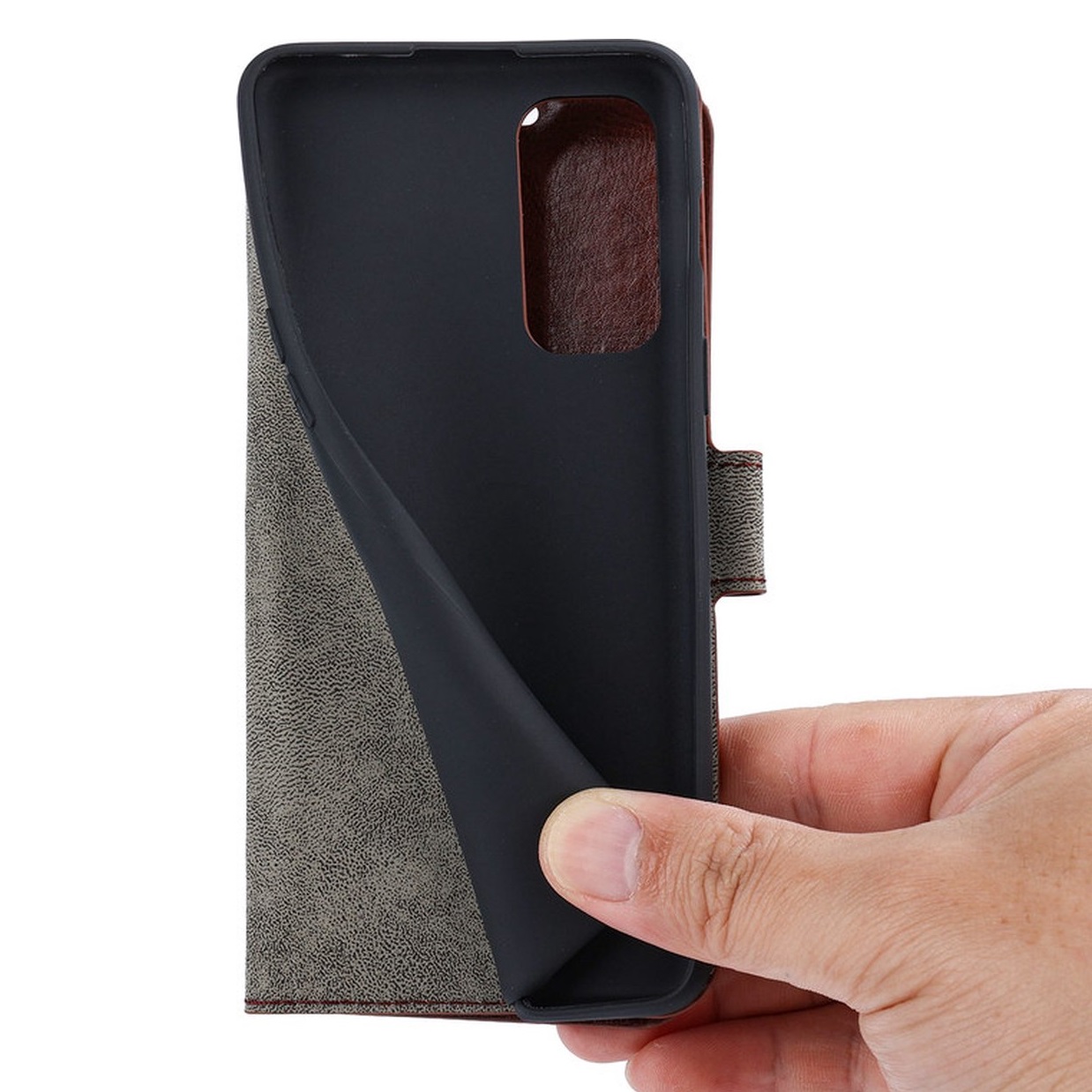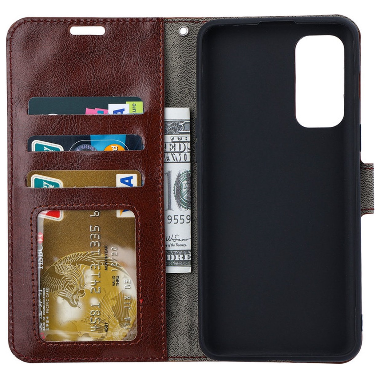 [ Portemonnee-ontwerp ] De Bruin gekleurde bookcase beschikt ook over kaartvakken, waarbij u uw belangrijke kaarten in kunt plaatsen. Portemonnee en telefoonhoesje in 1.