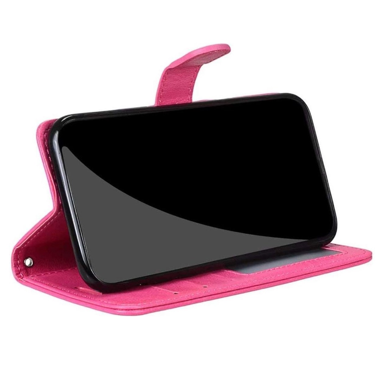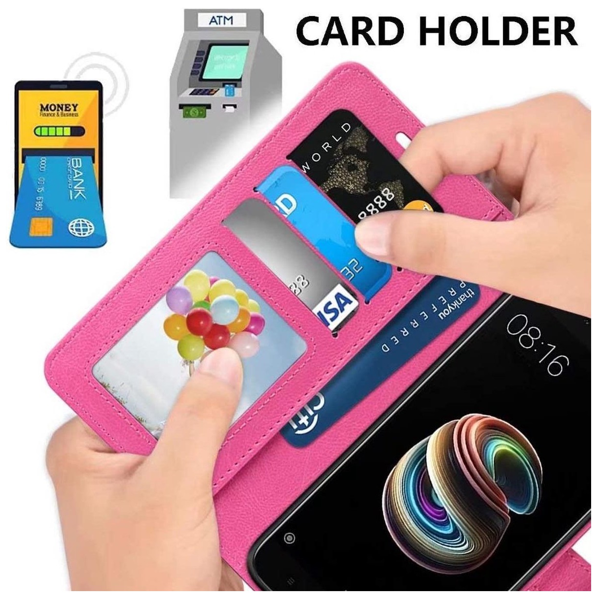 [ Portemonnee-ontwerp ] De Roze gekleurde bookcase beschikt ook over kaartvakken, waarbij u uw belangrijke kaarten in kunt plaatsen. Portemonnee en telefoonhoesje in 1.