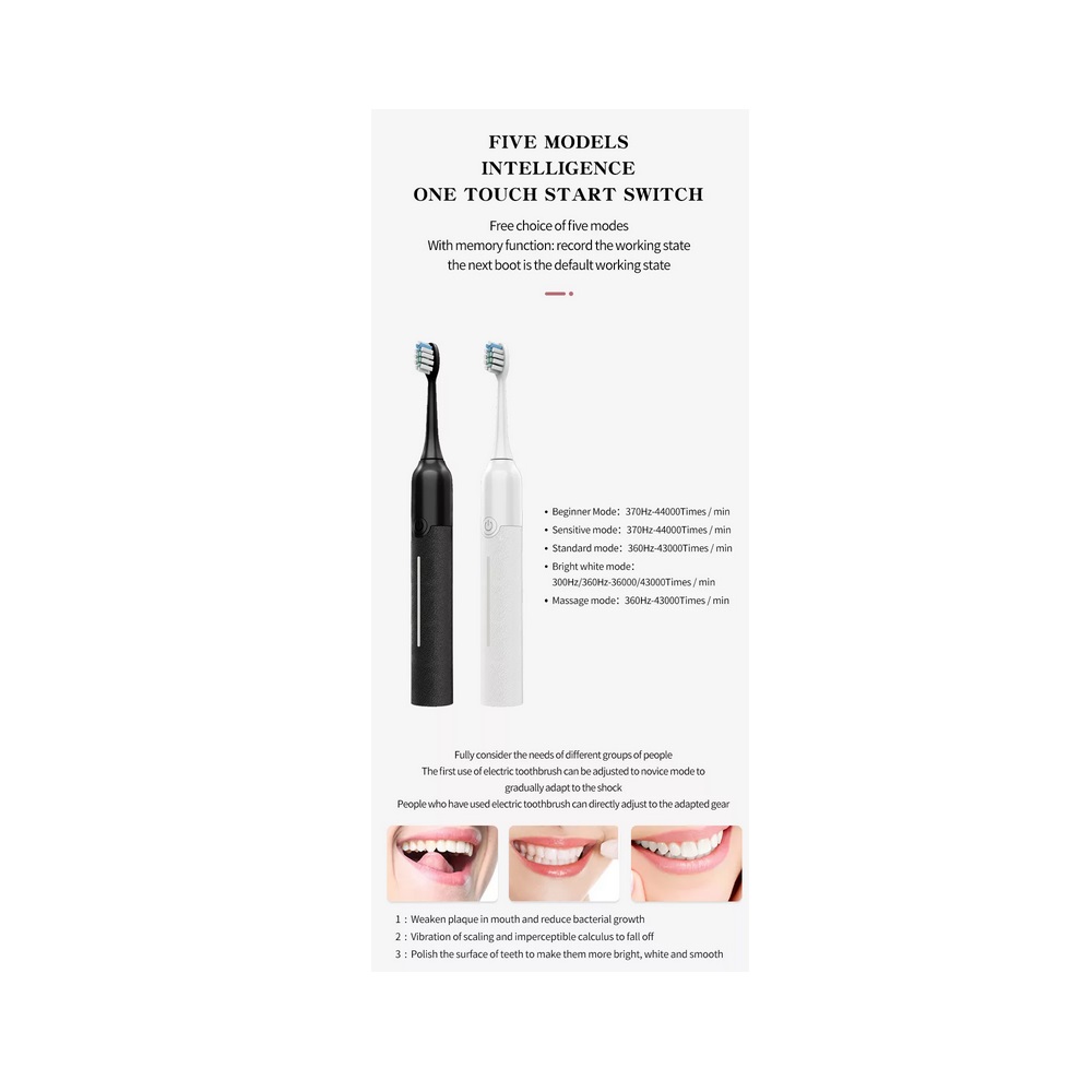 [Meerdere borsteltechnieken modes] Beginner, Sensitive, Standard, Bright White, en Massage.