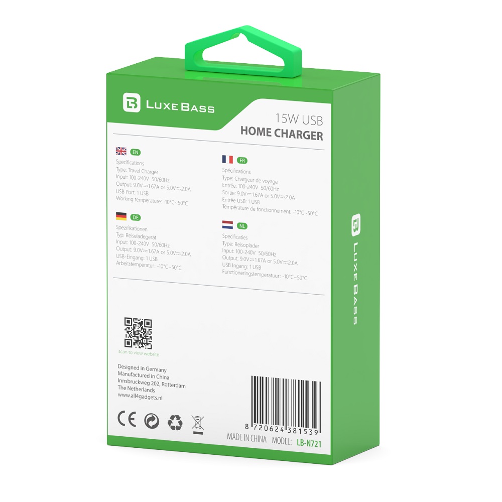 Ben je opzoek naar een oplader of wellicht meerdere opladers die een compact formaat hebben, goede kwaliteit heeft en ook nog eens geschikt is voor alle smarpthones? Dan is de Luxebass LBN721 de oplader die je zoekt. De oplader is ook nog is eens zeer scherp in prijs en is beschikbaar in twee verschillende kleuren: zwart en/of wit.