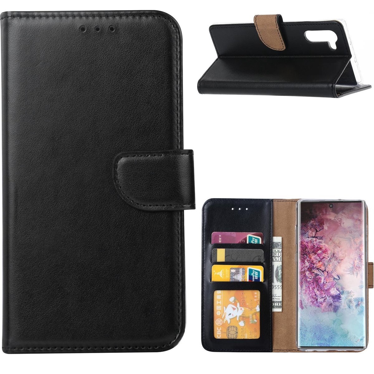 [Portemonnee-ontwerp] De Zwart gekleurde telefoonhoes is uitgerust met diverse kaart en geldvakken waarmee het de mogelijkheid biedt om het tevens als zijnde portemonnee te gebruiken.
