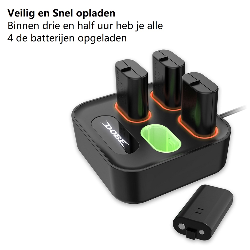 De Dobe Xbox One / Series X / Series S controller oplaadstation is een geweldig oplossing voor al je oplaadproblemen. Het is een handige oplaadstation dat perfect past bij Xbox One / Series X / Series S accus’s. Het oplaadstation is uitgerust met 4 stuks Lithium-ion batterijen met elk een opslagcapaciteit van 800mAh, waardoor je meerdere batterijen tegelijk kunt opladen. De batterijen worden opgeladen wanneer je niet aan het gamen bent waardoor je niet meer onverwachts een lege accu hebt. Het oplaadstation is voorzien van een LED indicator. De LED-indicator geeft aan wanneer het opladen is voltooid, zodat je je controllers nooit meer met lege batterijen hoeft achter te laten. Je kan ten allen tijden zoveel mogelijk accu’s tegelijkertijd opladen. Je hoeft dus niet een voor een te wachten. Het oplaadstation is voorzien van een stevig en stijlvol design en is daarnaast voorzien van een micro usb aansluiting die je kan aansluiten op vrijwel de meeste apparaten.