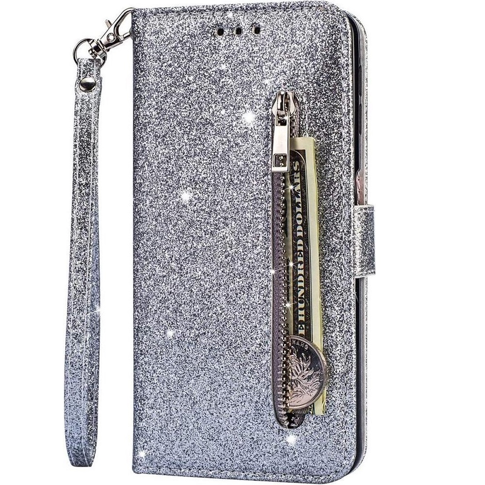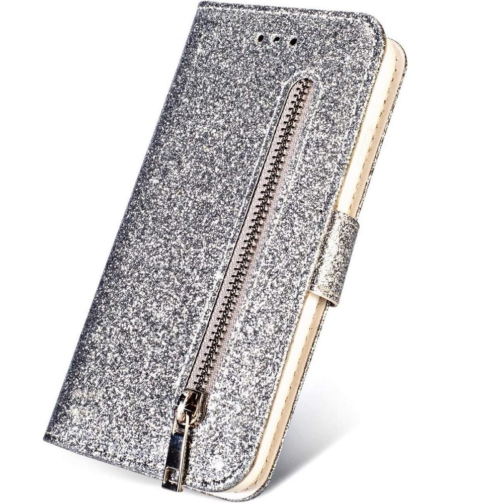 Hoesje geschikt voor Samsung Galaxy A51 Glitter Bookcase met rits – hoesje – portemonneehoesje – Zilver