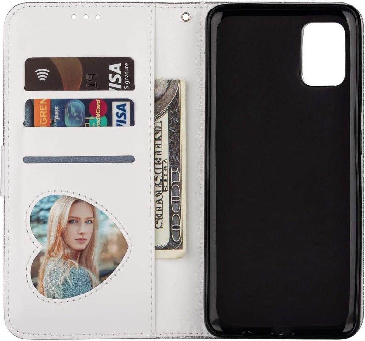 Dit glitter boek hoesje van LuxeBass is speciaal gemaakt voor uw Samsung Galaxy A51;Samsung Galaxy A51 5G. In de binnenkant van het hoesje zit een zachte transparante silicone houder, zo wordt uw Samsung Galaxy A51;Samsung Galaxy A51 5G in deze book case van alle kanten beschermd tegen vallen en of stoten. Het hoesje is ook voorzien van een magneetsluiting dat naar voren sluit. Dankzij de handige ontwerp van dit boekhoesje, kunt u bijvoorbeeld pasjes of briefgeld bewaren. Zo heeft u een bookhoesje en een portomonnee tegelijkertijd.
