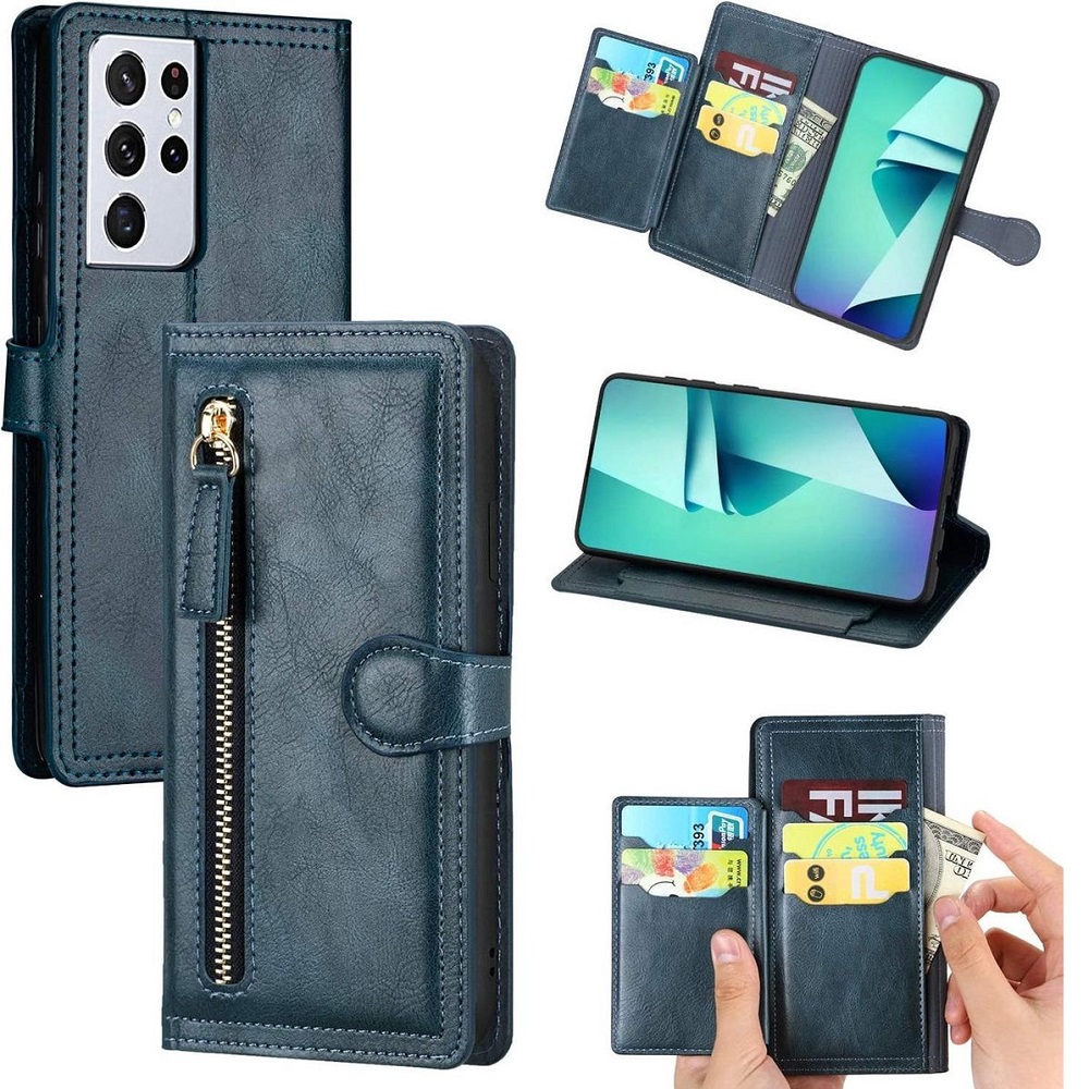 Hoesje geschikt voor Samsung Galaxy S21 Book case met ritssluiting van LuxeBass – Flipcover – Magnetisch – 5 kaarten houder – Donkerblauw