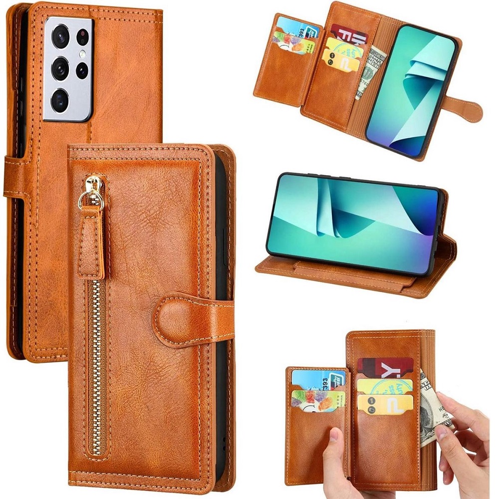 Hoesje geschikt voor Samsung Galaxy S21 Book case met ritssluiting van LuxeBass – Flipcover – Magnetisch – 5 kaarten houder – Lichtbruin