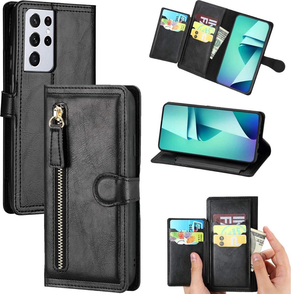 Hoesje geschikt voor Samsung Galaxy S21 Plus Book case met ritssluiting van LuxeBass – Flipcover – Magnetisch – 5 kaarten houder – Zwart