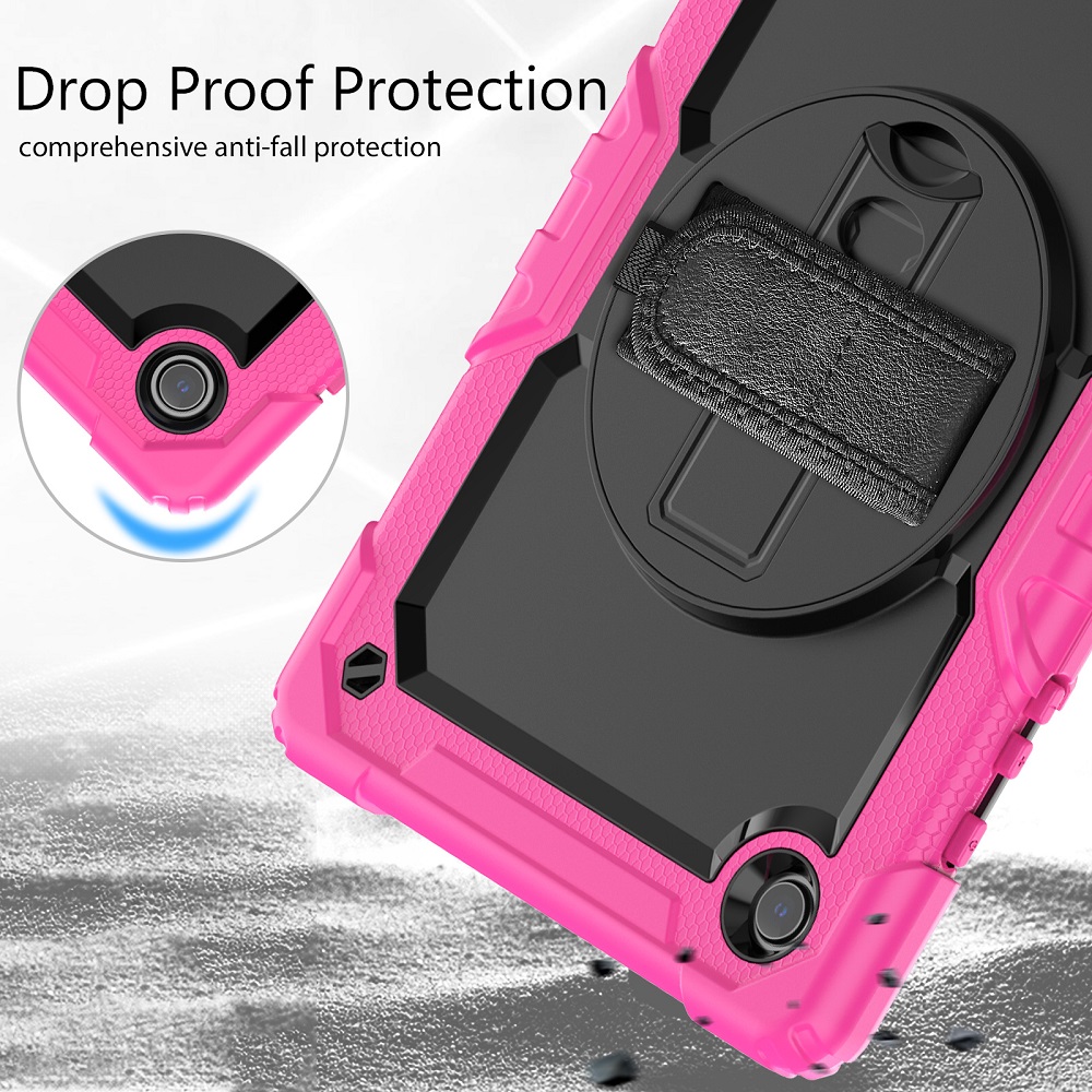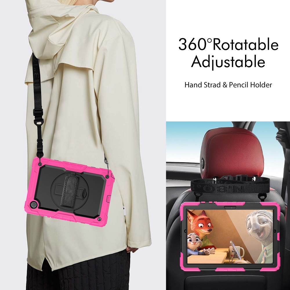 De beschermhoes zorgt voor een volledige bescherming en heeft een strap die je kan gebruiken om je handen erin te doen of eventueel vast te maken aan een object. Ook is het voorzien van een riem die je kan gebruiken om de tablet te dragen of vast te maken aan een object. Daarnaast is het voorzien van een roteerbaar standaard waarmee je de tablet zowel verticaal of horizontaal ergens te plaatsen.