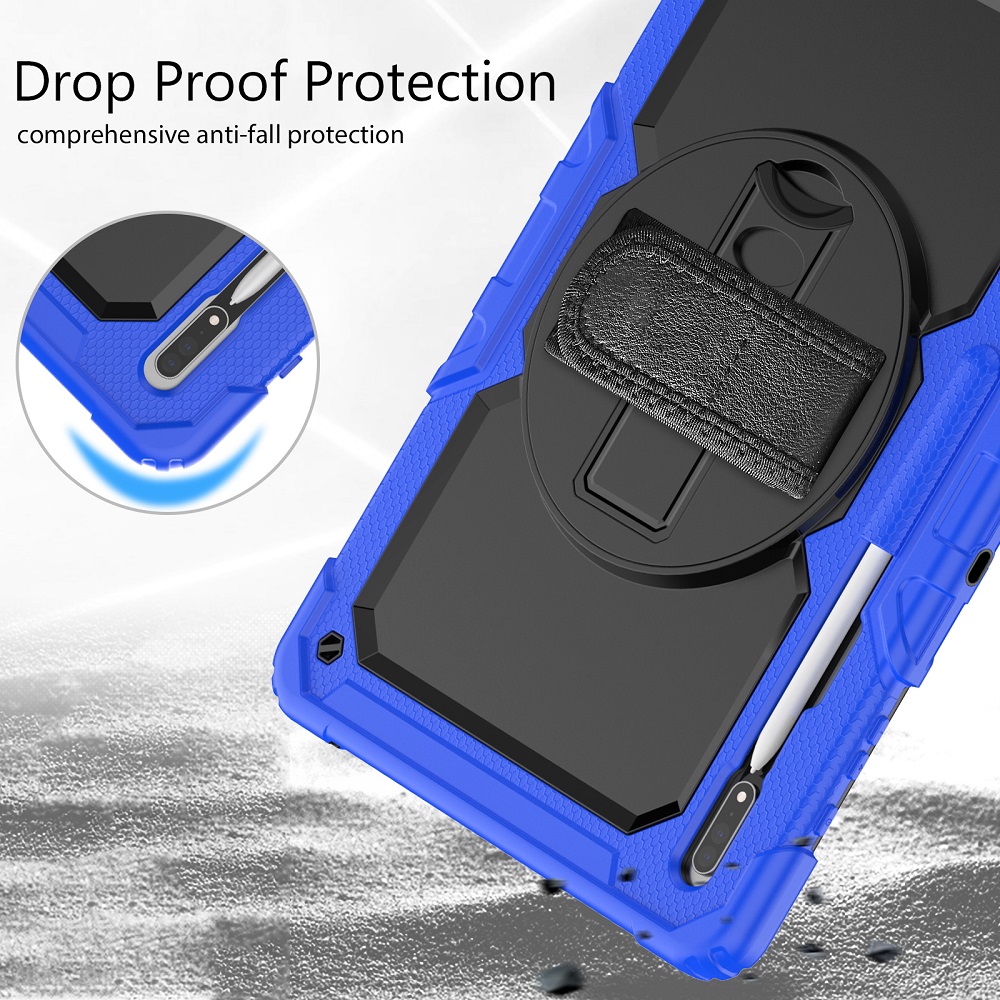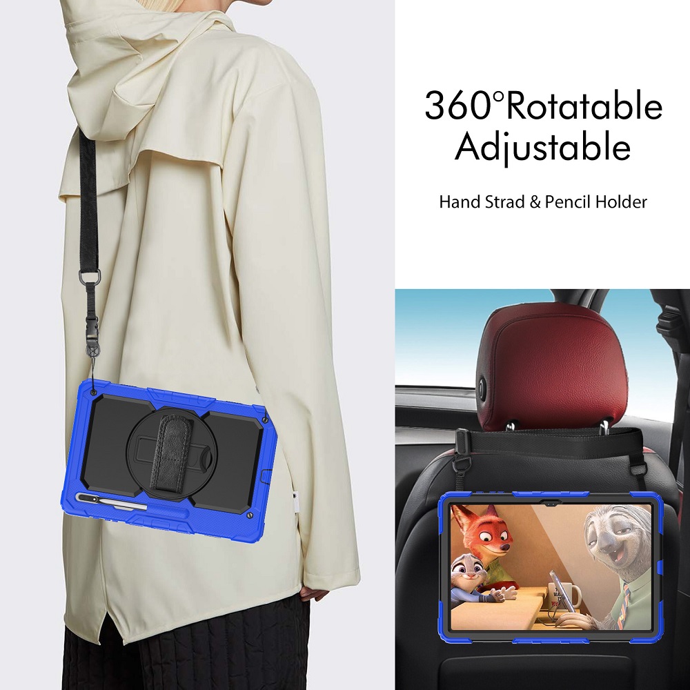 De beschermhoes zorgt voor een volledige bescherming en heeft een strap die je kan gebruiken om je handen erin te doen of eventueel vast te maken aan een object. Ook is het voorzien van een riem die je kan gebruiken om de tablet te dragen of vast te maken aan een object. Daarnaast is het voorzien van een roteerbaar standaard waarmee je de tablet zowel verticaal of horizontaal ergens te plaatsen.