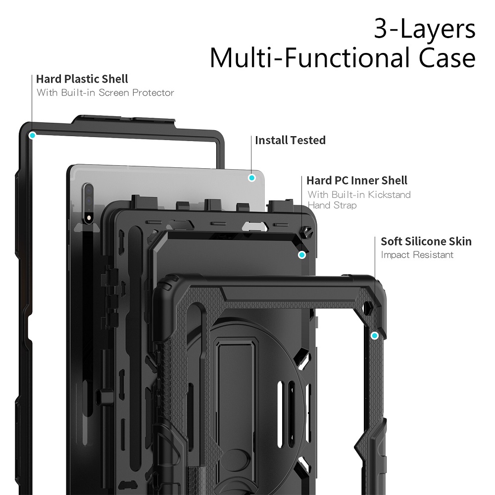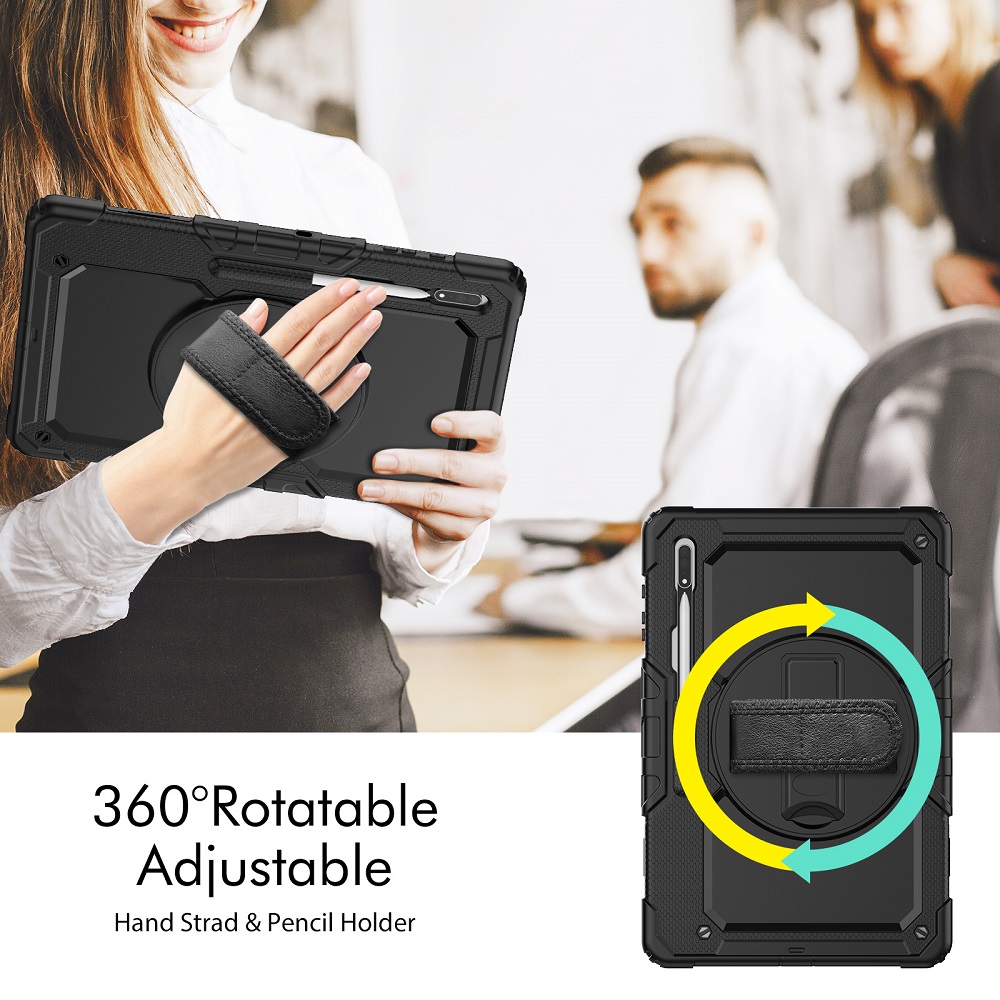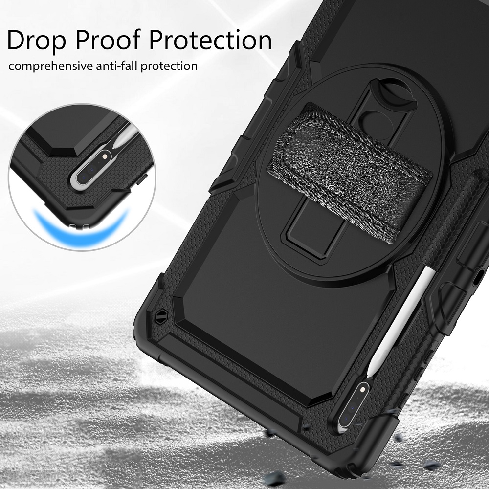 De beschermhoes zorgt voor een volledige bescherming en heeft een strap die je kan gebruiken om je handen erin te doen of eventueel vast te maken aan een object. Ook is het voorzien van een riem die je kan gebruiken om de tablet te dragen of vast te maken aan een object. Daarnaast is het voorzien van een roteerbaar standaard waarmee je de tablet zowel verticaal of horizontaal ergens te plaatsen.
