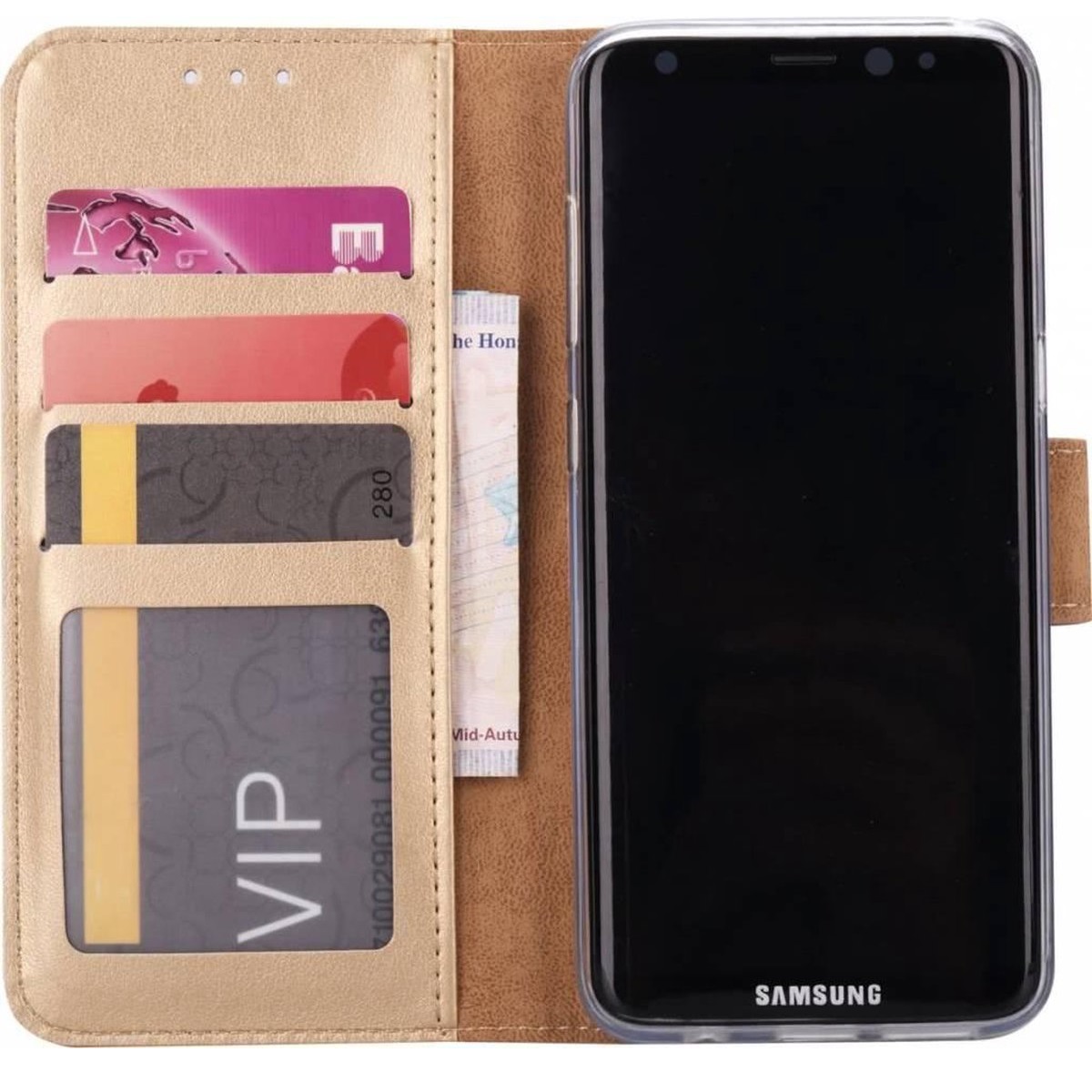 [Portemonnee-ontwerp] De goud gekleurde telefoonhoes is uitgerust met diverse kaart en geldvakken waarmee het de mogelijkheid biedt om het tevens als zijnde portemonnee te gebruiken.