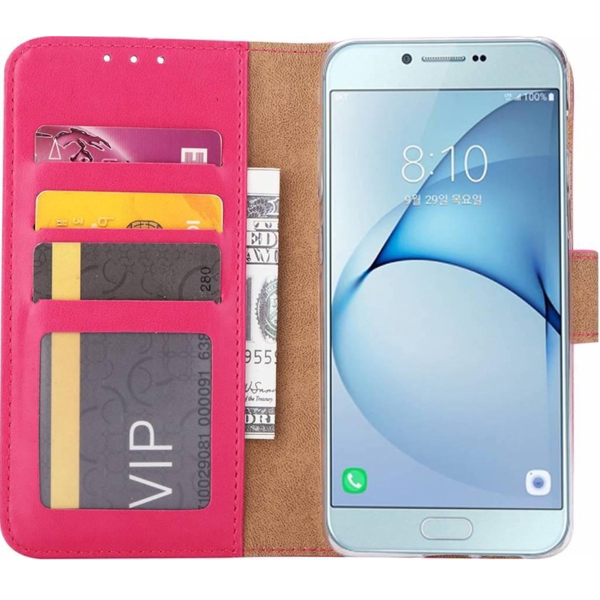 [Portemonnee-ontwerp] De Roze gekleurde telefoonhoes is uitgerust met diverse kaart en geldvakken waarmee het de mogelijkheid biedt om het tevens als zijnde portemonnee te gebruiken.