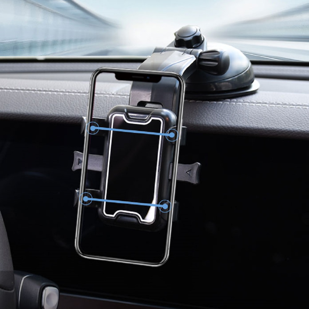 De mobiele mobiele telefoon zit dankzij het klemsysteem en zuignap stevig vast op het dashboard. Dus scherpe bochten, harde drempels en offroad wegen hebben geen invloed op de stabiliteit.