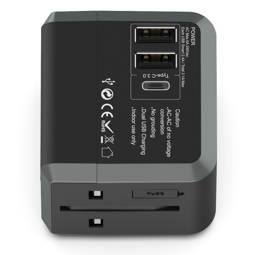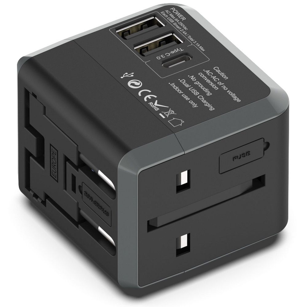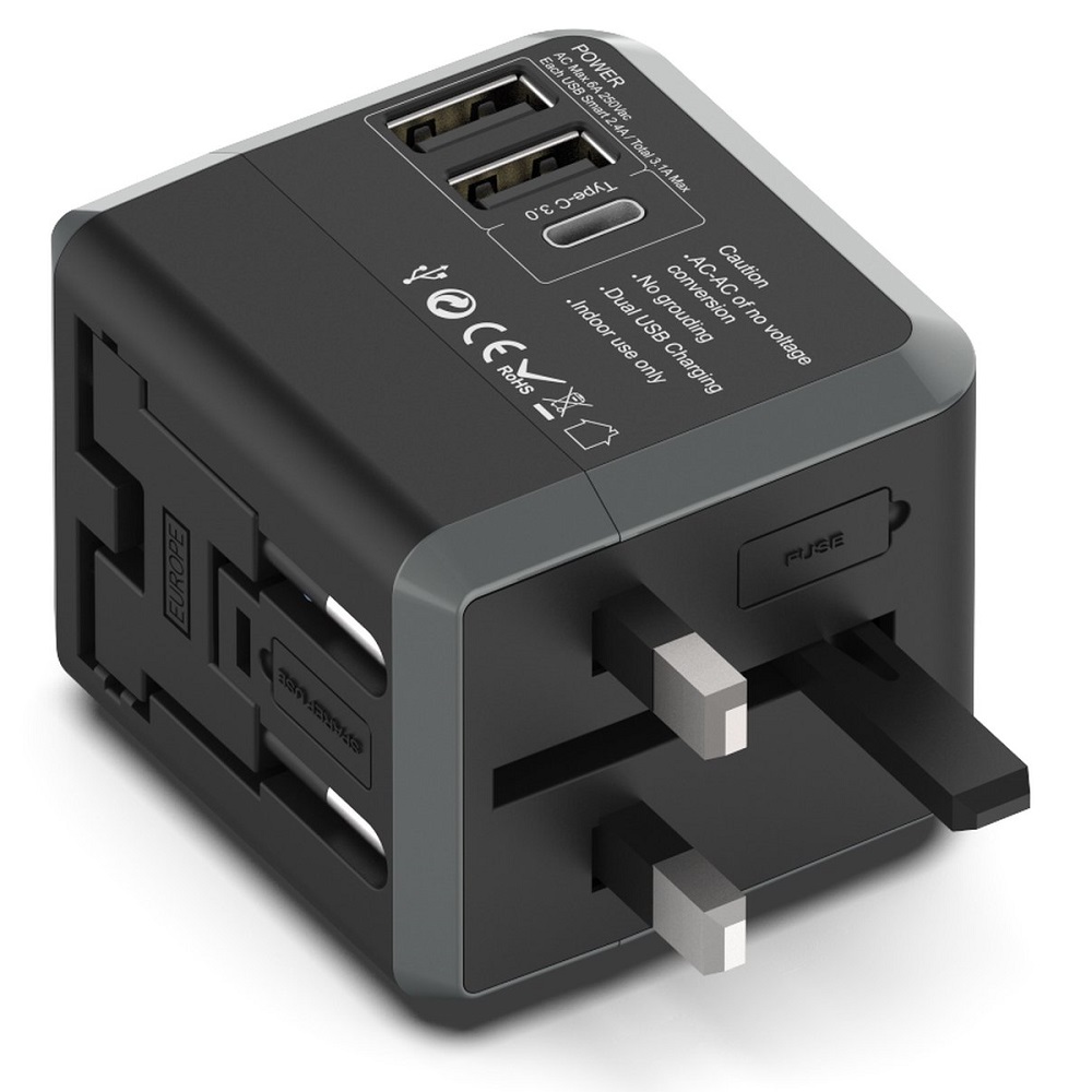 Met de Universele wereldstekker hoef je nooit meer je apparatuur aan te passen aan de lokale stekker. Deze universele reisstekker beschikt over een stevig en duurzaam ontwerp en is geschikt voor gebruik in meer dan 150 landen. De reisstekker heeft drie USB-A aansluitingen en een USB-C aansluiting, waarmee je verschillende apparaten kunt opladen. Met een maximaal vermogen van 3.1A voor de USB-A aansluitingen en 2.4A voor de USB-C aansluiting, kun je zelfs krachtigere apparaten opladen. De aansluitingen zijn stevig en staan in verschillende richtingen, wat het opladen van meerdere apparaten tegelijk eenvoudig maakt.