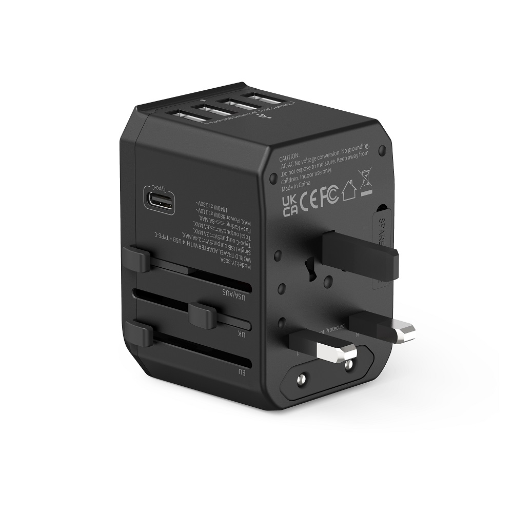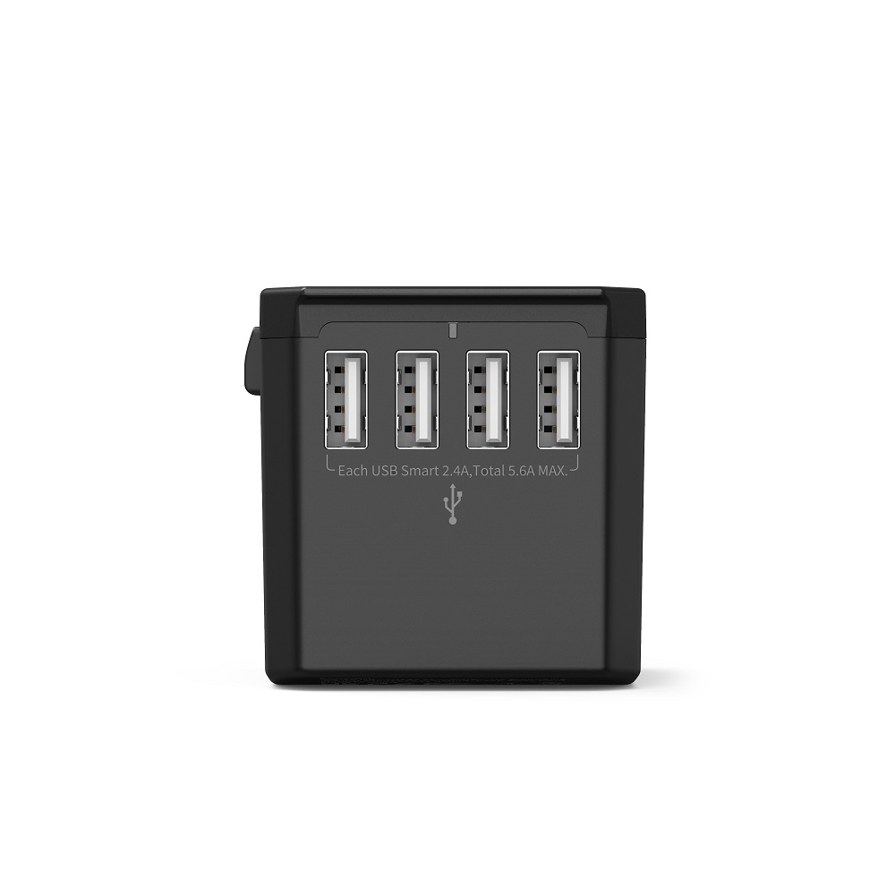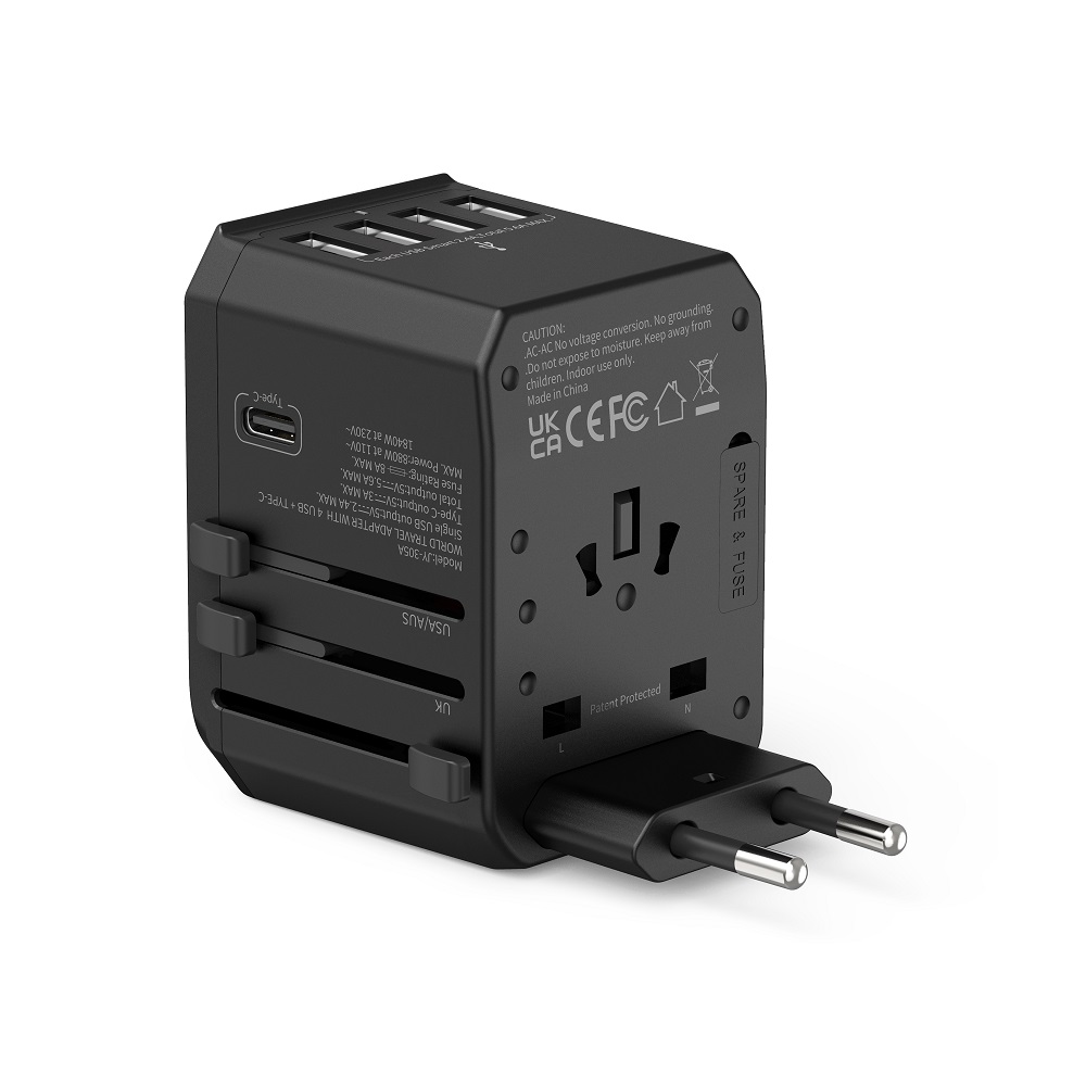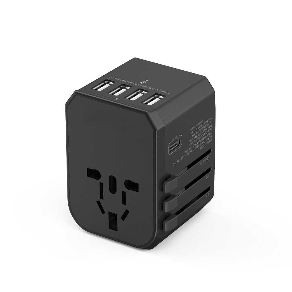 Universele Wereldstekker met 4 USB poorten + 1 USB-C poort | JY305A Zwart