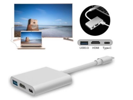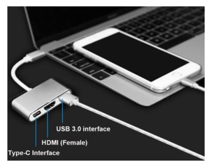 De USB-C 3 connector maakt het mogelijk om 1 USB type-C poort “om te zetten” naar 3 poorten met ondersteuning van opladen, HDMI en een USB 3.0 poort.
